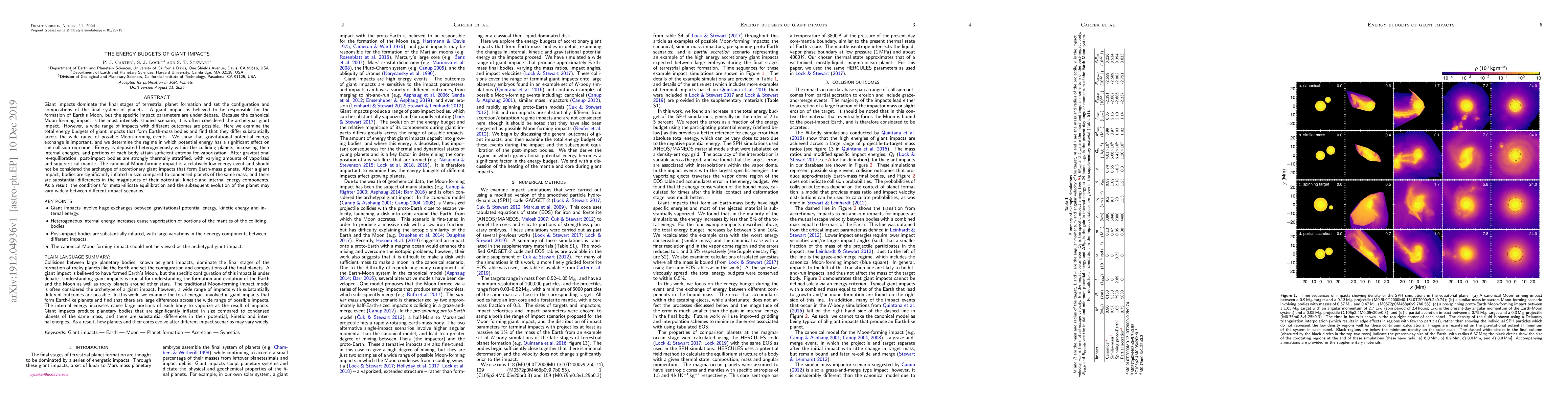 Giant impacts dominate the final stages of terrestrial planet formation and set the configuration and compositions of the final system of planets. A giant impact is believed to be responsible for the formation of Earth's Moon, but the specific impact parameters are under debate. Because the canonical Moon-forming impact is the most intensely studied scenario, it is often considered the archetypal giant impact. However, a wide range of impacts with different outcomes are possible. Here we examine the total energy budgets of giant impacts that form Earth-mass bodies and find that they differ substantially across the wide range of possible Moon-forming events. We show that gravitational potential energy exchange is important, and we determine the regime in which potential energy has a significant effect on the collision outcome. Energy is deposited heterogeneously within the colliding planets, increasing their internal energies, and portions of each body attain sufficient entropy for vaporization. After gravitational re-equilibration, post-impact bodies are strongly thermally stratified, with varying amounts of vaporized and supercritical mantle. The canonical Moon-forming impact is a relatively low energy event and should not be considered the archetype of accretionary giant impacts that form Earth-mass planets. After a giant impact, bodies are significantly inflated in size compared to condensed planets of the same mass, and there are substantial differences in the magnitudes of their potential, kinetic and internal energy components. As a result, the conditions for metal-silicate equilibration and the subsequent evolution of the planet may vary widely between different impact scenarios.