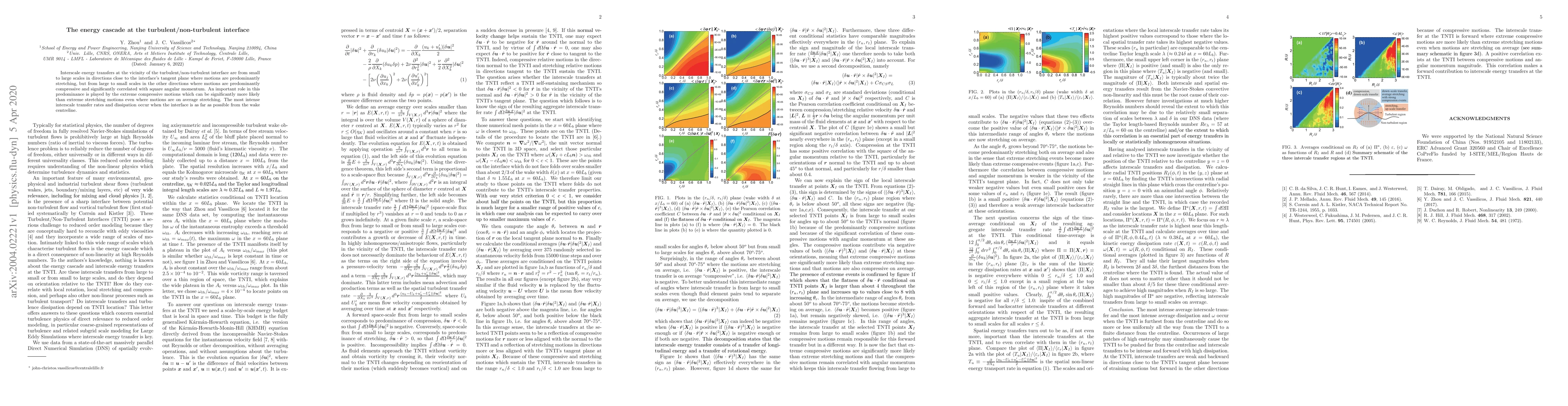 This study investigates energy cascades at the turbulent/non-turbulent interface, revealing that energy transfers predominantly from small to large scales near the interface's tangent plane due to stretching motions, while large to small scales occur in other directions due to compressive motions correlated with square angular momentum. The most intense energy transfer and dissipation occur when the interface is farthest from the wake centerline.