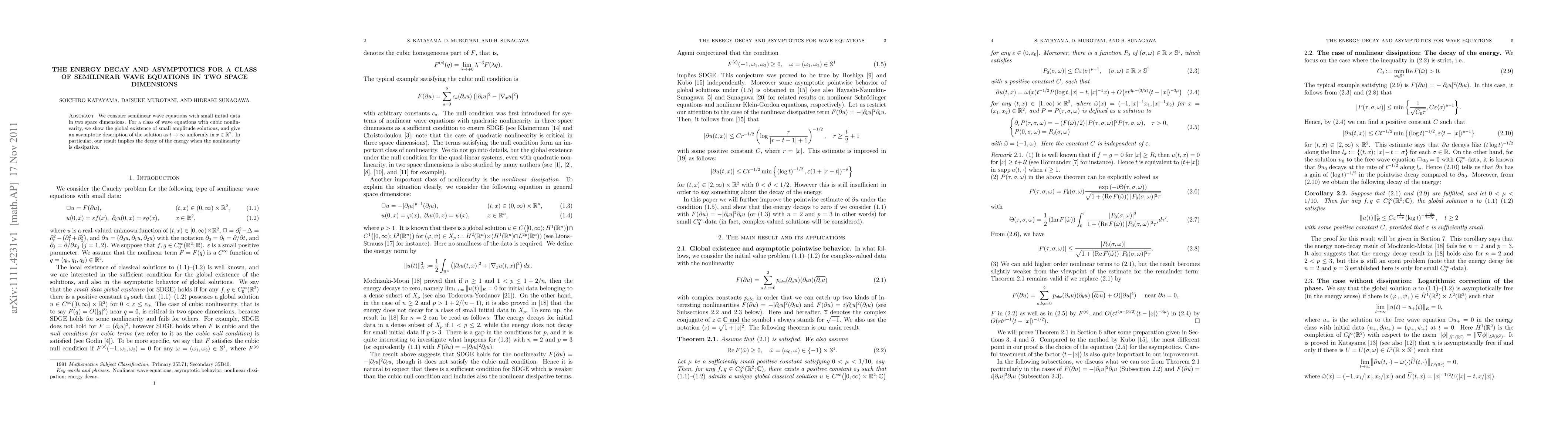Summary: This paper investigates semilinear wave equations with cubic nonlinearity in two dimensions, proving global existence of small amplitude solutions and demonstrating energy decay as time approaches infinity, under dissipative conditions.