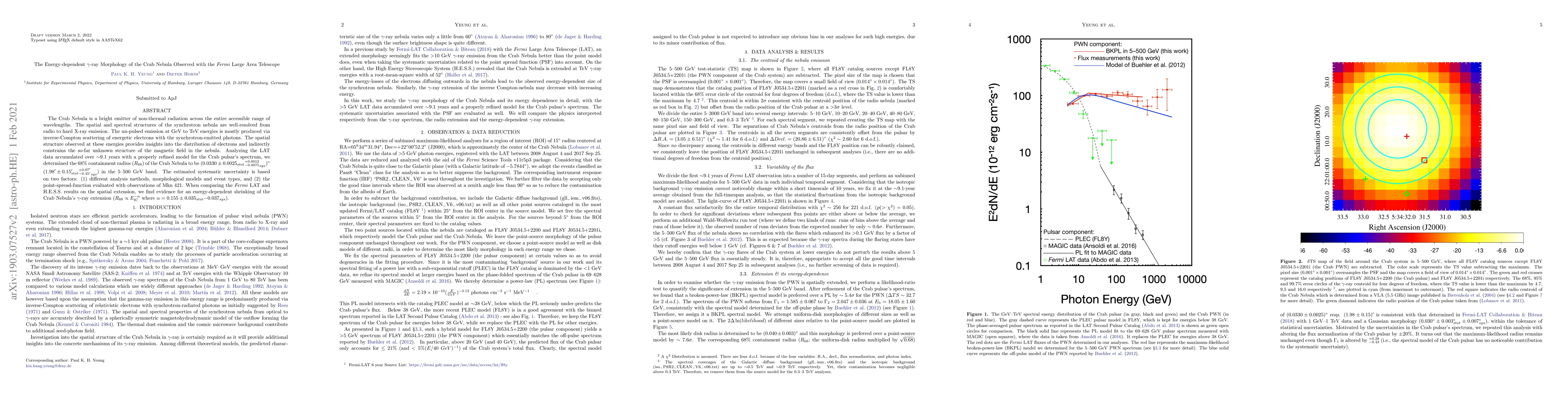This research utilizes Fermi LAT data over 9 years to determine the Crab Nebula's 68% containment radius in the 5-500 GeV band as 0.033 degrees (1.98'). The study also reveals an energy-dependent shrinking of the nebula's gamma-ray extension, suggesting that the nebula's structure varies with gamma-ray energy.