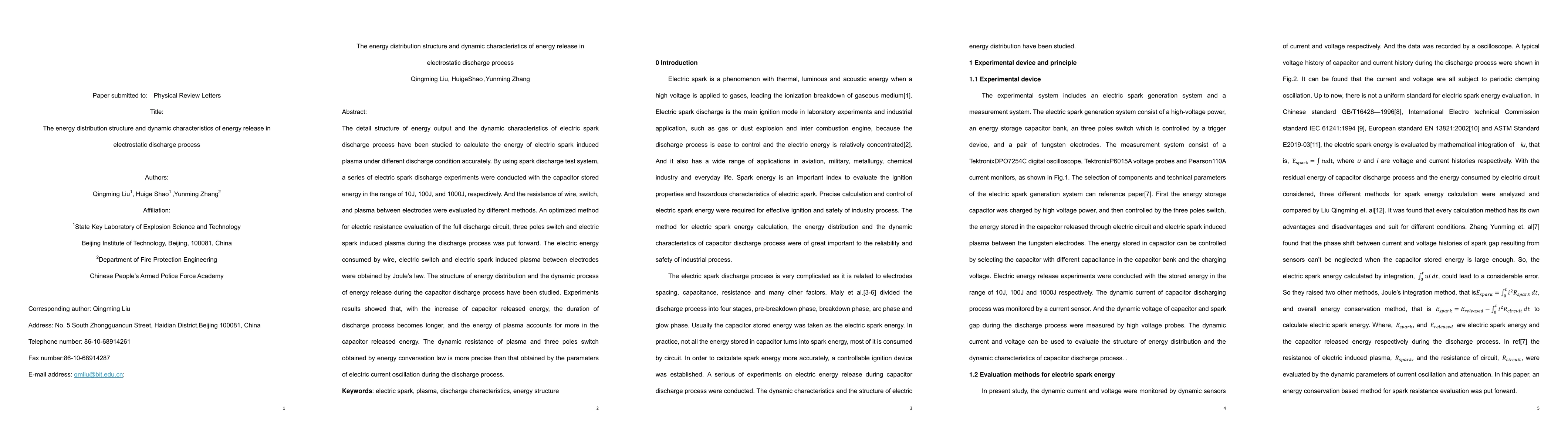 This paper explores the energy distribution and dynamic characteristics of electric spark discharge, focusing on the energy consumed by wire, switch, and plasma under varying capacitor discharge conditions. Experimental results indicate that higher capacitor energy leads to longer discharge durations and greater plasma energy contribution, with dynamic resistance measurements showing improved accuracy via energy conservation laws.