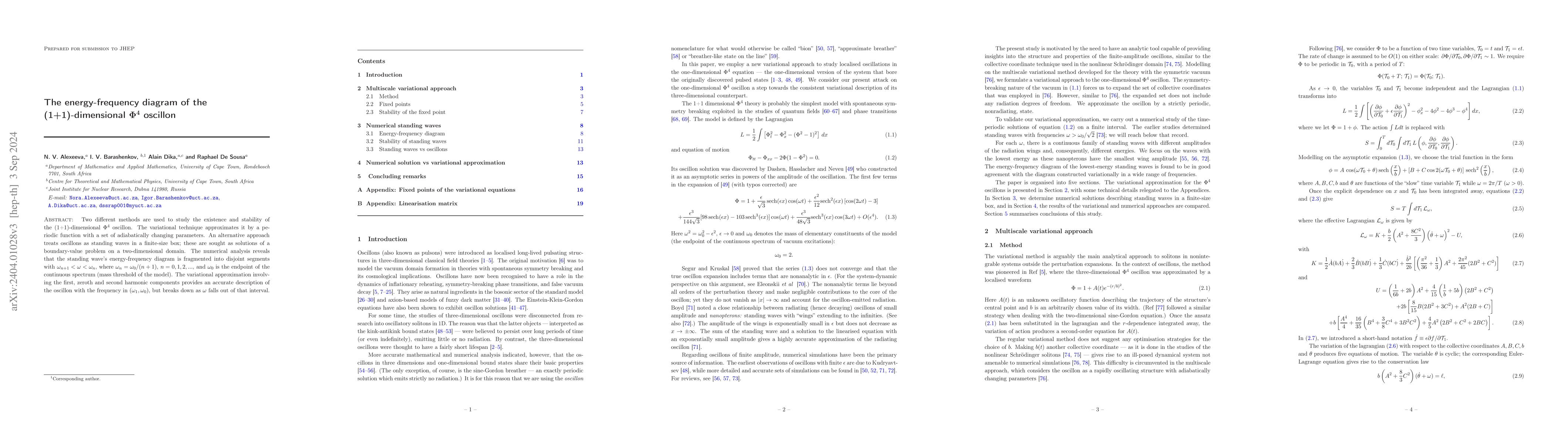Two different methods are used to study the existence and stability of the (1+1)-dimensional $\Phi^4$ oscillon. The variational technique approximates it by a periodic function with a set of adiabatically changing parameters. An alternative approach treats oscillons as standing waves in a finite-size box; these are sought as solutions of a boundary-value problem on a two-dimensional domain. The numerical analysis reveals that the standing wave's energy-frequency diagram is fragmented into disjoint segments with $\omega_{n-1} < \omega < \omega_{n-2}$, where $\omega_n=\frac{2}{n+1}$. In the interval $(\omega_{n-1}, \omega_{n-2})$, the structure's small-amplitude wings are formed by the $n$-th harmonic radiation ($n=2,3, ...$). All standing waves are practically stable: perturbations may result in the deformation of the wave's radiation wings but do not affect its core. The variational approximation involving the first, zeroth and second harmonic components provides an accurate description of the oscillon with the frequency in $(\omega_1, \omega_0)$, but breaks down as $\omega$ falls out of that interval.