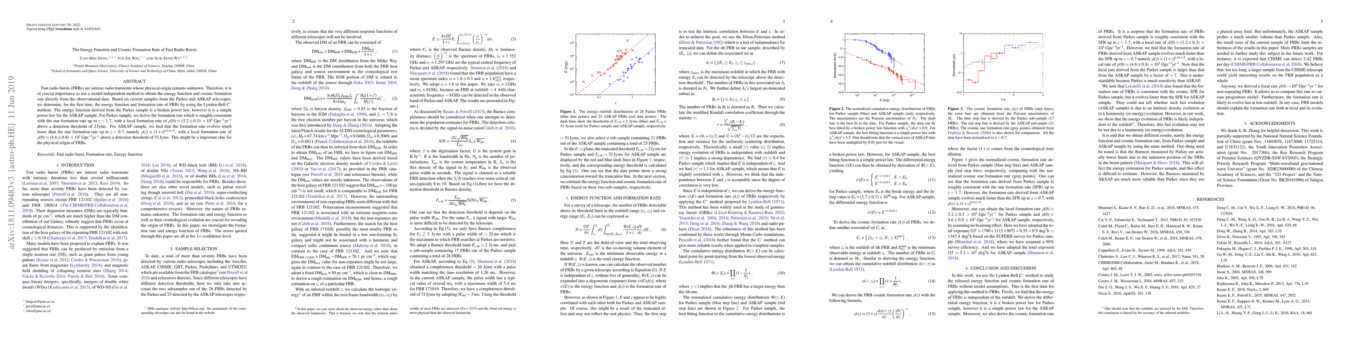 A study using the Lynden-Bell C^- method determines the energy function and cosmic formation rate of Fast Radio Bursts for the first time, with different results for two datasets from Parkes and ASKAP telescopes.