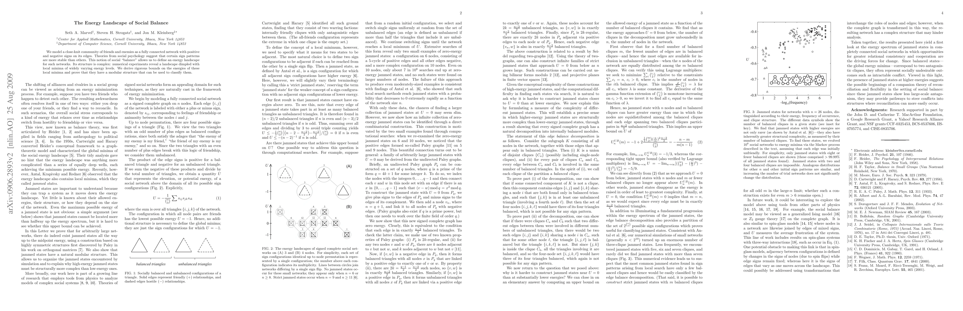 Researchers model a network of friends and enemies to understand social balance, finding a complex energy landscape with local minima of varying energy levels. They derive bounds on these energies and classify them using modular structures.