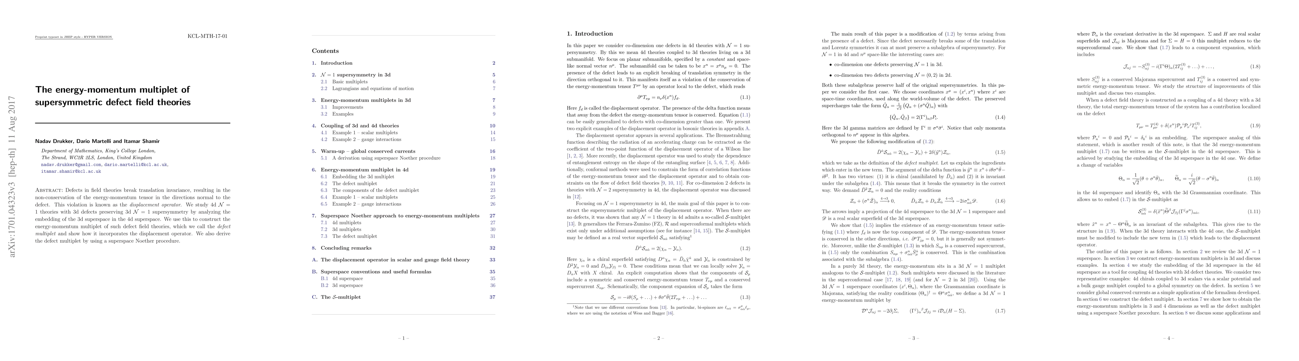 Defects in field theories break translation invariance, resulting in the non-conservation of the energy-momentum tensor in the directions normal to the defect. This violation is known as the displacement operator. We study 4d ${\cal N}=1$ theories with 3d defects preserving 3d ${\cal N}=1$ supersymmetry by analyzing the embedding of the 3d superspace in the 4d superspace. We use this to construct the energy-momentum multiplet of such defect field theories, which we call the defect multiplet and show how it incorporates the displacement operator. We also derive the defect multiplet by using a superspace Noether procedure.