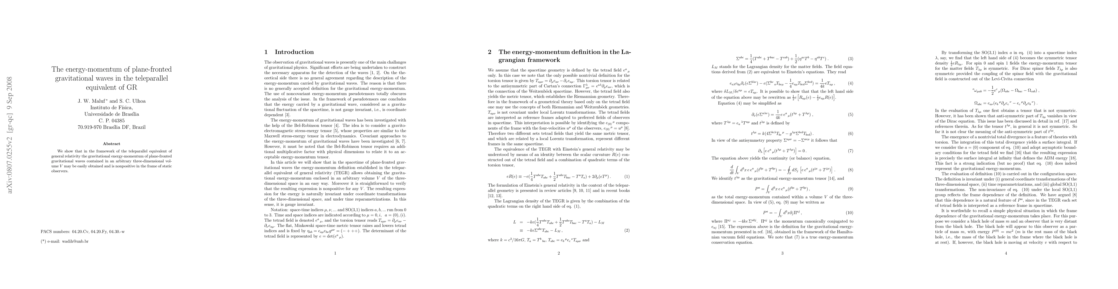 Summary: This paper demonstrates that in the teleparallel equivalent of general relativity, the gravitational energy-momentum of plane-fronted gravitational waves within a volume V can be straightforwardly calculated and is non-negative for static observers.