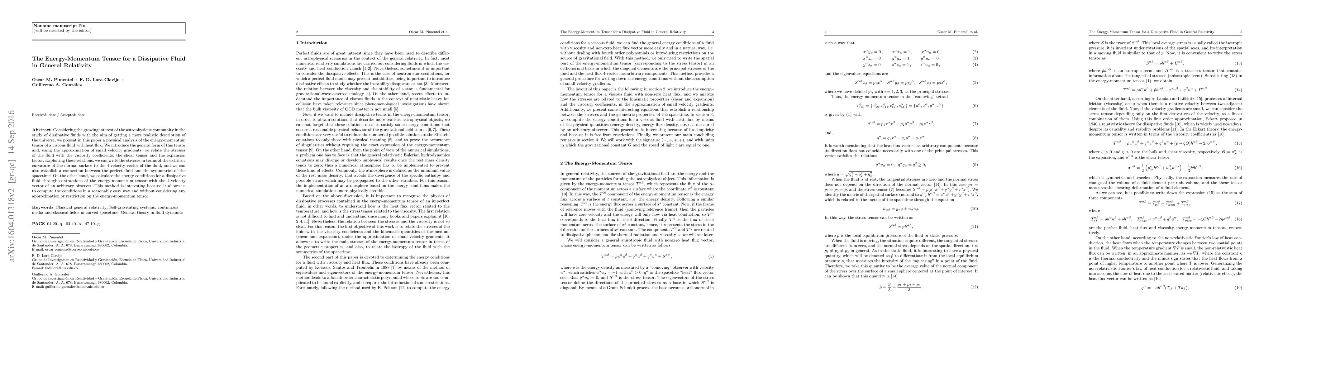 This paper analyzes the energy-momentum tensor for a dissipative viscous fluid in general relativity, relating fluid stresses to viscosity coefficients and expansion factor. It also establishes a connection between the fluid's properties and spacetime symmetries, and computes energy conditions without approximations.