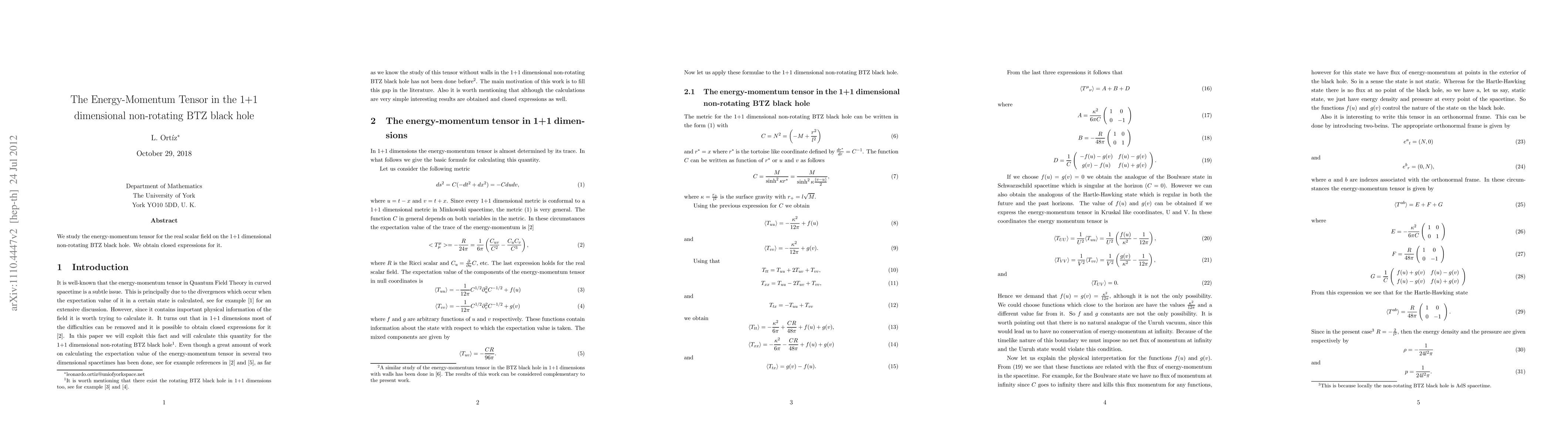 Summary: The paper derives closed expressions for the energy-momentum tensor of a real scalar field in the context of a 1+1 dimensional non-rotating BTZ black hole, providing a detailed analysis of its properties.