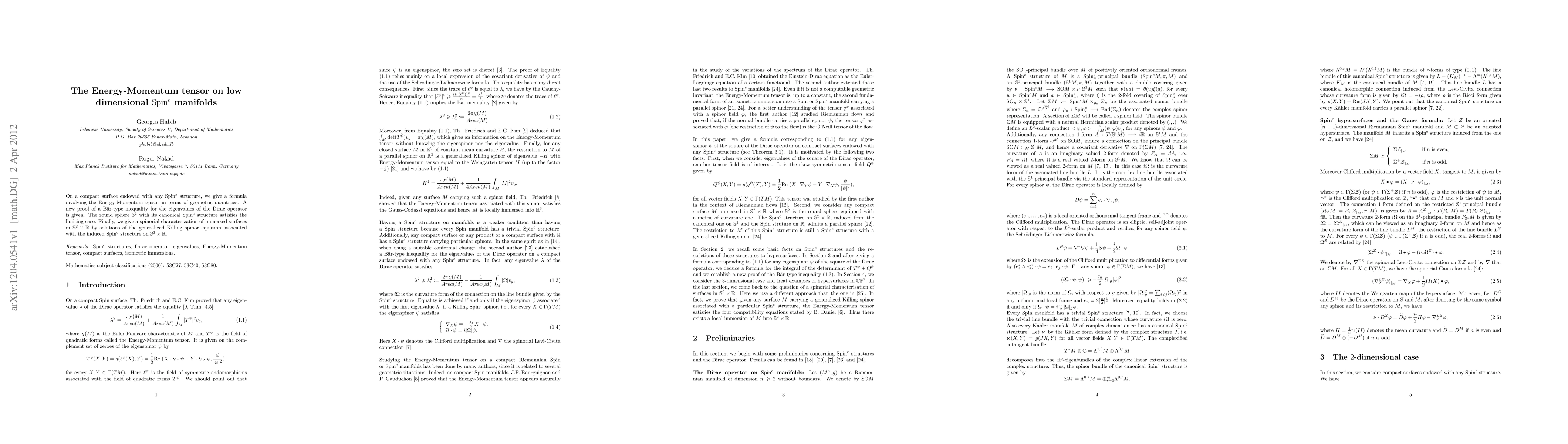 This paper presents a formula for the Energy-Momentum tensor on compact surfaces with any $Spinc$ structure, using geometric quantities. It also provides a new proof of a B"{a}r-type inequality for Dirac operator eigenvalues, with the round sphere $mathbb{S}^2$ as a limiting case. Furthermore, it offers a spinorial characterization of immersed surfaces in $mathbb{S}^2 imes mathbb{R}$ via generalized Killing spinor equations.