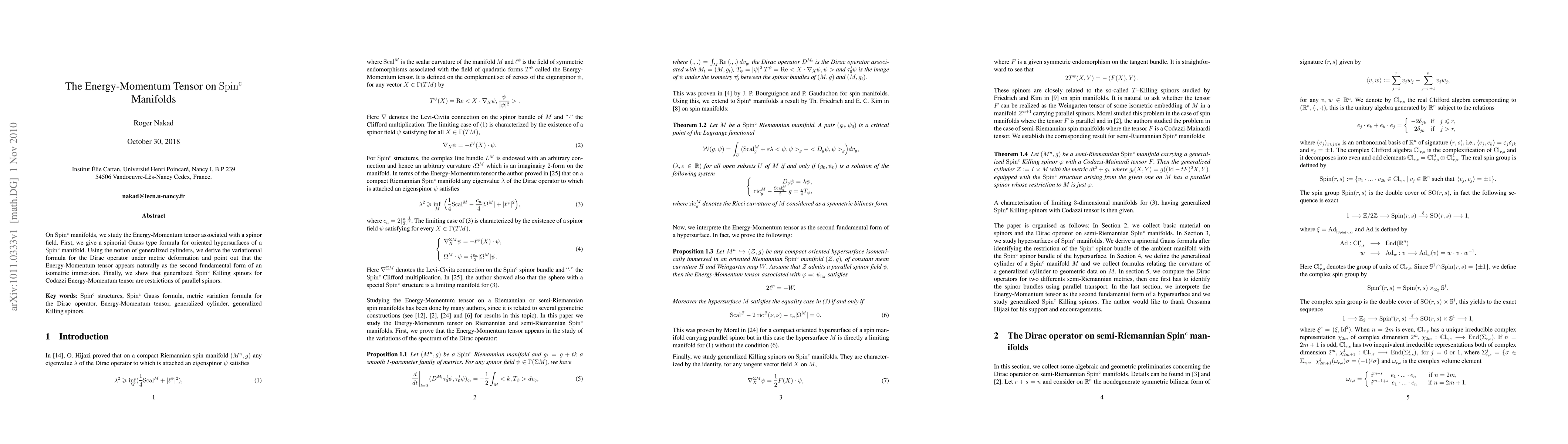 This paper investigates the Energy-Momentum tensor for spinor fields on $Spin^c$ manifolds, deriving a spinorial Gauss formula and a variational formula for the Dirac operator. It concludes that the tensor emerges as the second fundamental form in isometric immersions and relates generalized $Spin^c$ Killing spinors to parallel spinors.