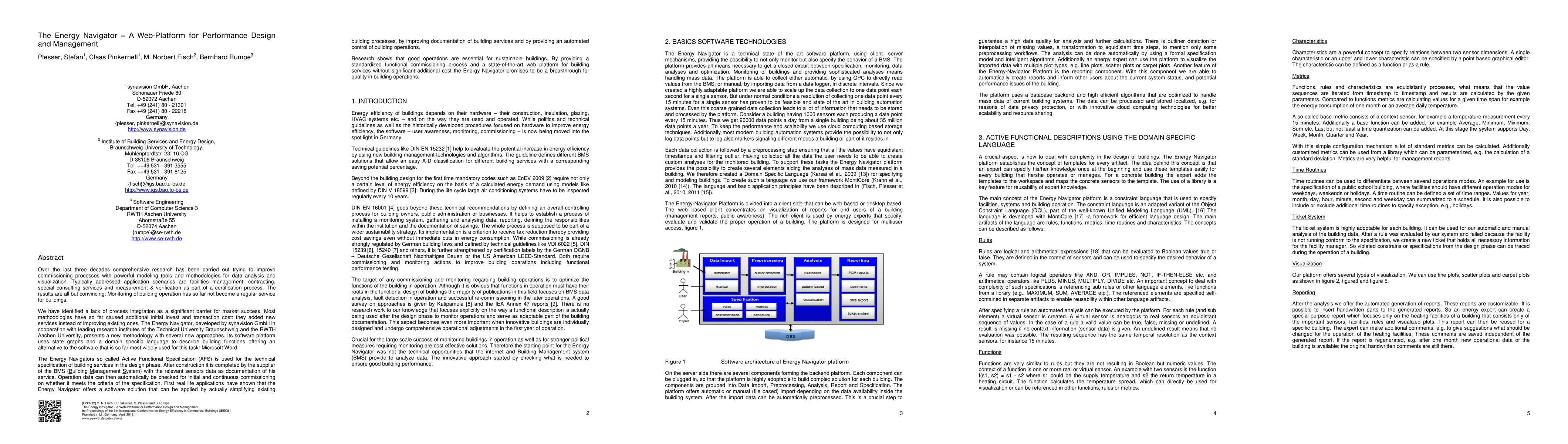 The Energy Navigator is a new web-platform developed to improve building operation performance design and management through integrated methodologies and Active Functional Specification (AFS). It aims to overcome existing barriers by offering a cost-effective alternative to traditional tools, facilitating continuous commissioning and monitoring of building services.