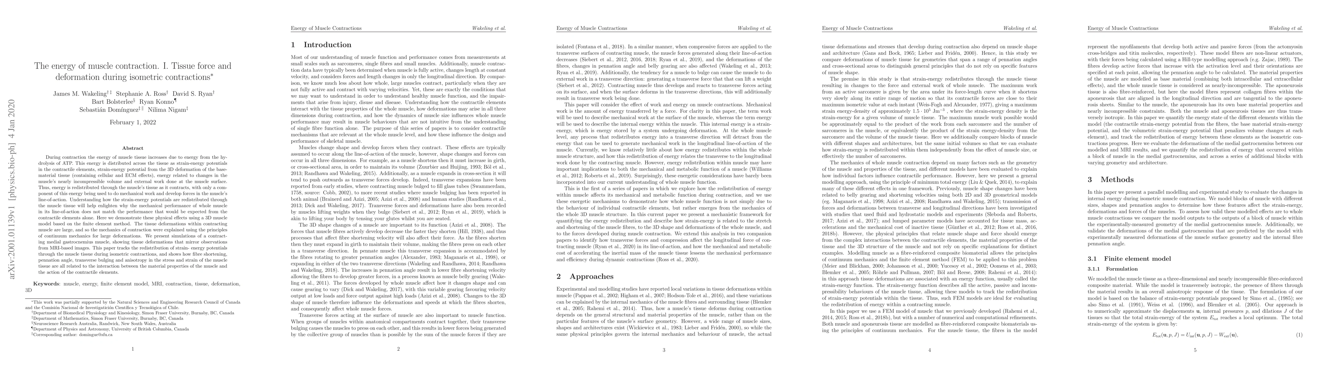 During contraction the energy of muscle tissue increases due to energy from the hydrolysis of ATP. This energy is distributed across the tissue as strain-energy potentials in the contractile elements, strain-energy potential from the 3D deformation of the base-material tissue (containing cellular and ECM effects), energy related to changes in the muscle's nearly incompressible volume and external work done at the muscle surface. Thus, energy is redistributed through the muscle's tissue as it contracts, with only a component of this energy being used to do mechanical work and develop forces in the muscle's line-of-action. Understanding how the strain-energy potentials are redistributed through the muscle tissue will help enlighten why the mechanical performance of whole muscle in its line-of-action does not match the performance that would be expected from the contractile elements alone. Here we demonstrate these physical effects using a 3D muscle model based on the finite element method. The tissue deformations within contracting muscle are large, and so the mechanics of contraction were explained using the principles of continuum mechanics for large deformations. We present simulations of a contracting medial gastrocnemius muscle, showing tissue deformations that mirror observations from MRI-based images. This paper tracks the redistribution of strain-energy potentials through the muscle tissue during isometric contractions, and shows how fibre shortening, pennation angle, transverse bulging and anisotropy in the stress and strain of the muscle tissue are all related to the interaction between the material properties of the muscle and the action of the contractile elements.