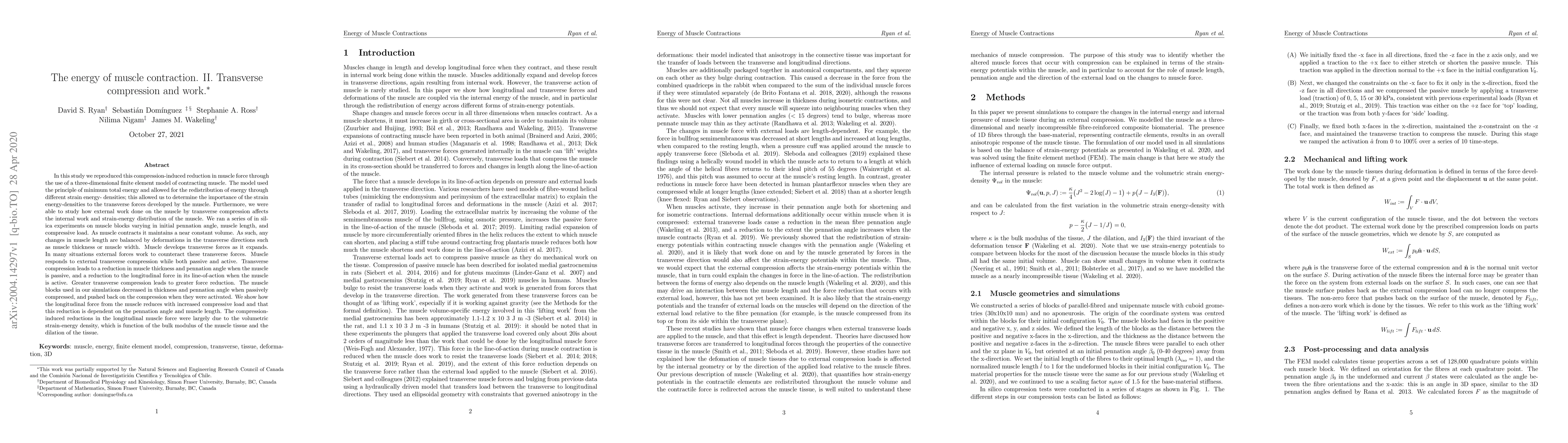 In this study we reproduced this compression-induced reduction in muscle force through the use of a three-dimensional finite element model of contracting muscle. The model used the principle of minimum total energy and allowed for the redistribution of energy through different strain energy-densities; this allowed us to determine the importance of the strain energy-densities to the transverse forces developed by the muscle. Furthermore, we were able to study how external work done on the muscle by transverse compression affects the internal work and strain-energy distribution of the muscle.