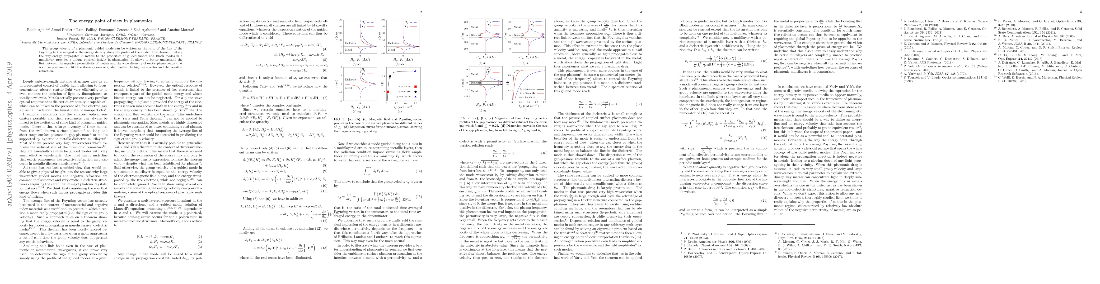 The group velocity of a plasmonic guided mode can be written as the ratio of the flux of the Poynting to the integral of the energy density along the profile of the mode. This theorem, linking the way energy propagates in metals to the properties of guided modes and Bloch modes in a multilayer, provides a unique physical insight in plasmonics. It allows to better understand the link between the negative permittivity of metals and the wide diversity of exotic phenomenon that occur in plasmonics -- like the slowing down of guided modes, the high wavevector and the negative refraction.
