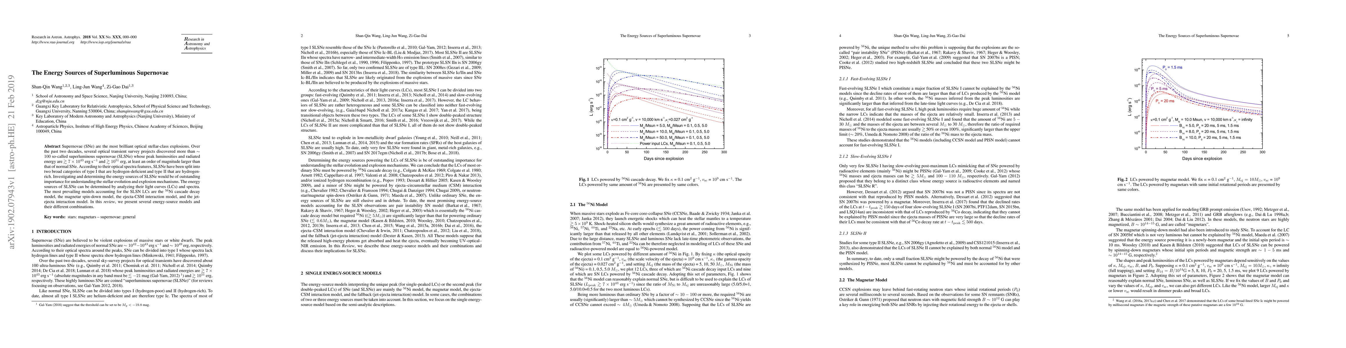 Supernovae (SNe) are the most brilliant optical stellar-class explosions. Over the past two decades, several optical transient survey projects discovered more than $\sim 100$ so-called superluminous supernovae (SLSNe) whose peak luminosities and radiated energy are $\gtrsim 7\times 10^{43}$ erg s$^{-1}$ and $\gtrsim 10^{51}$ erg, at least an order of magnitude larger than that of normal SNe. According to their optical spectra features, SLSNe have been split into two broad categories of type I that are hydrogen-deficient and type II that are hydrogen-rich. Investigating and determining the energy sources of SLSNe would be of outstanding importance for understanding the stellar evolution and explosion mechanisms. The energy sources of SLSNe can be determined by analyzing their light curves (LCs) and spectra. The most prevailing models accounting for the SLSN LCs are the $^{56}$Ni cascade decay model, the magnetar spin-down model, the ejecta-CSM interaction model, and the jet-ejecta interaction model. In this \textit{review}, we present several energy-source models and their different combinations.