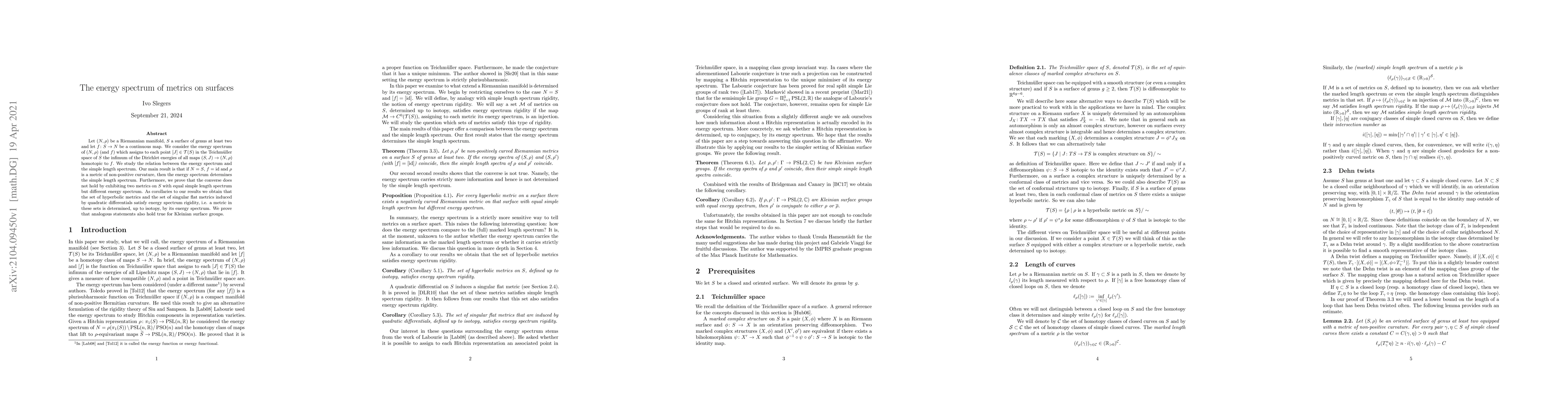 This paper investigates the energy spectrum of metrics on surfaces, showing that for surfaces with non-positive curvature, the energy spectrum determines the simple length spectrum. It also demonstrates that while the energy spectrum can uniquely identify certain classes of metrics, the converse is not true, as shown by metrics with identical simple length spectra but different energy spectra.