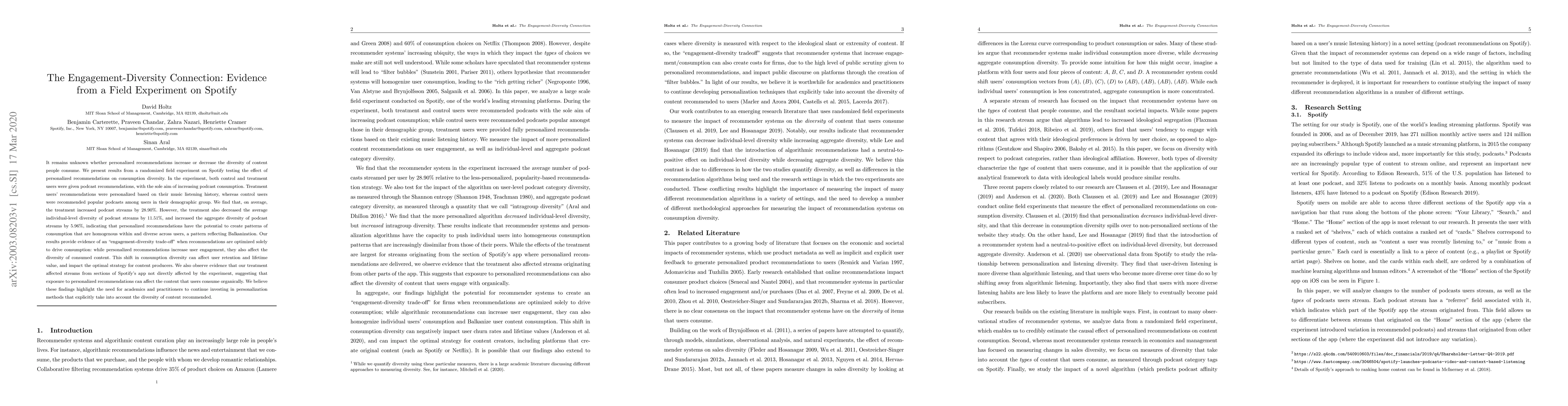 This study on Spotify reveals that personalized recommendations boost user engagement by 28.90% but reduce individual-level podcast diversity by 11.51%, while increasing aggregate diversity by 5.96%. The findings suggest an "engagement-diversity trade-off," highlighting the need for methods that balance both user engagement and content diversity.