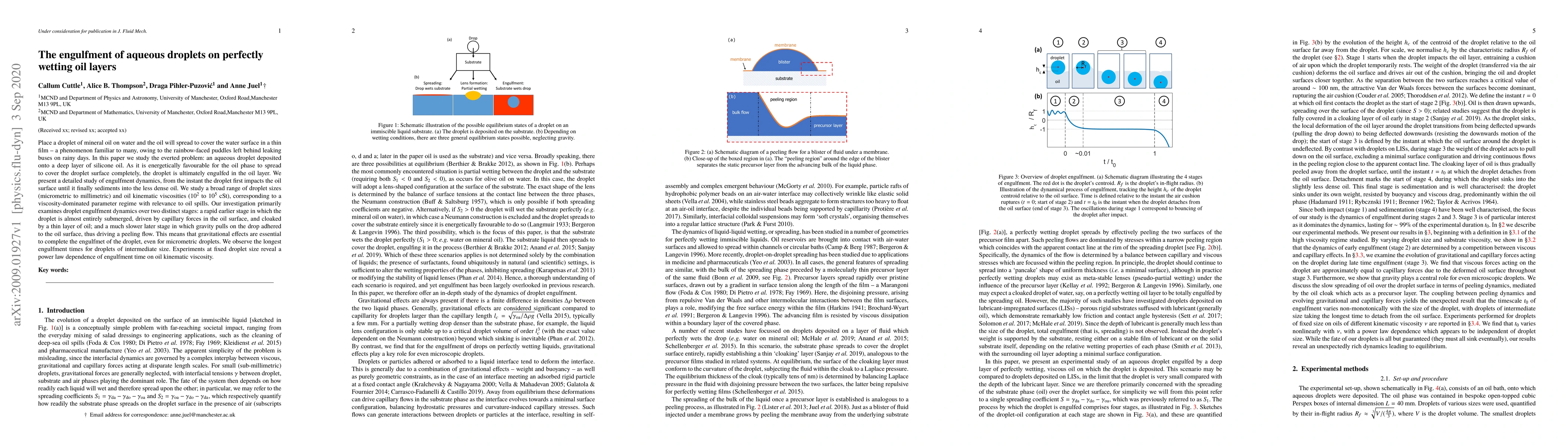 This paper investigates the engulfment dynamics of aqueous droplets deposited onto silicone oil layers, focusing on the rapid initial submersion driven by capillary forces and the subsequent slower gravitational peeling stage. The study reveals that intermediate-sized droplets experience the longest engulfment times, with a power law dependence on oil viscosity.