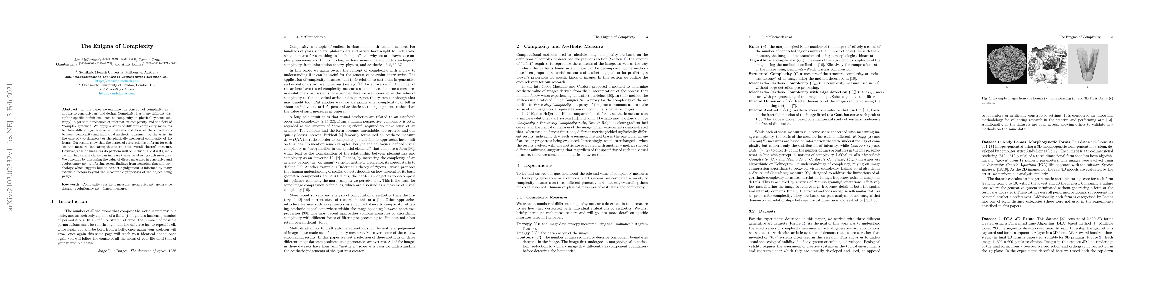 In this paper we examine the concept of complexity as it applies to generative art and design. Complexity has many different, discipline specific definitions, such as complexity in physical systems (entropy), algorithmic measures of information complexity and the field of "complex systems". We apply a series of different complexity measures to three different generative art datasets and look at the correlations between complexity and individual aesthetic judgement by the artist (in the case of two datasets) or the physically measured complexity of 3D forms. Our results show that the degree of correlation is different for each set and measure, indicating that there is no overall "better" measure. However, specific measures do perform well on individual datasets, indicating that careful choice can increase the value of using such measures. We conclude by discussing the value of direct measures in generative and evolutionary art, reinforcing recent findings from neuroimaging and psychology which suggest human aesthetic judgement is informed by many extrinsic factors beyond the measurable properties of the object being judged.