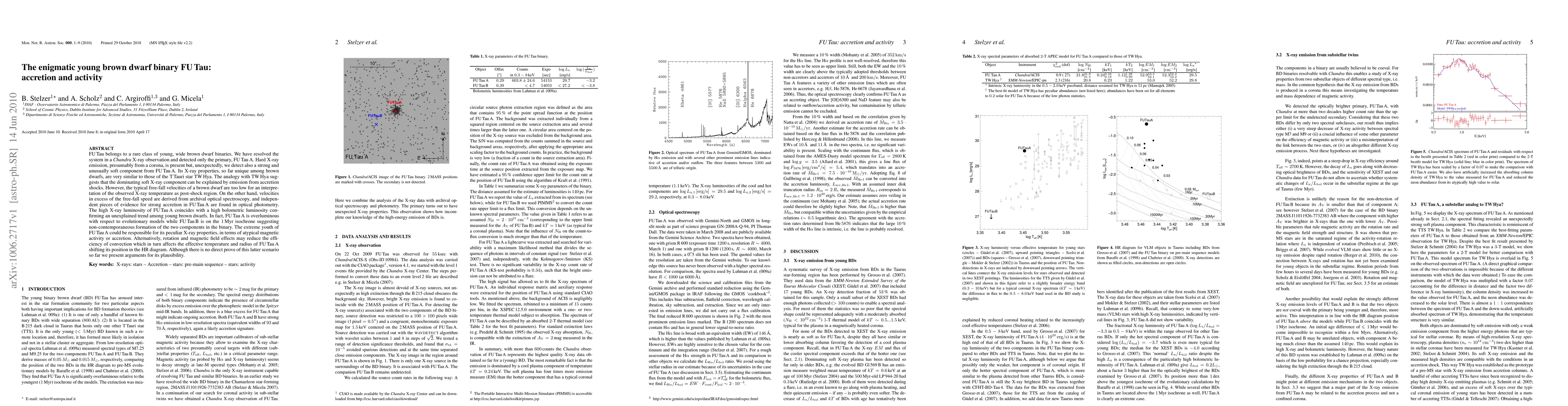 FU Tau belongs to a rare class of young, wide brown dwarf binaries. We have resolved the system in a Chandra X-ray observation and detected only the primary, FU Tau A. Hard X-ray emission, presumably from a corona, is present but, unexpectedly, we detect also a strong and unusually soft component from FU Tau A. Its X-ray properties, so far unique among brown dwarfs, are very similar to those of the T Tauri star TW Hya. The analogy with TW Hya suggests that the dominating soft X-ray component can be explained by emission from accretion shocks. However, the typical free-fall velocities of a brown dwarf are too low for an interpretation of the observed X-ray temperature as post-shock region. On the other hand, velocities in excess of the free-fall speed are derived from archival optical spectroscopy, and independent pieces of evidence for strong accretion in FU Tau A are found in optical photometry. The high X-ray luminosity of FU Tau A coincides with a high bolometric luminosity confirming an unexplained trend among young brown dwarfs. In fact, FU Tau A is overluminous with respect to evolutionary models while FU Tau B is on the 1 Myr isochrone suggesting non-contemporaneous formation of the two components in the binary. The extreme youth of FU Tau A could be responsible for its peculiar X-ray properties, in terms of atypical magnetic activity or accretion. Alternatively, rotation and magnetic field effects may reduce the efficiency of convection which in turn affects the effective temperature and radius of FU Tau A shifting its position in the HR diagram. Although there is no direct prove of this latter scenario so far we present arguments for its plausibility.