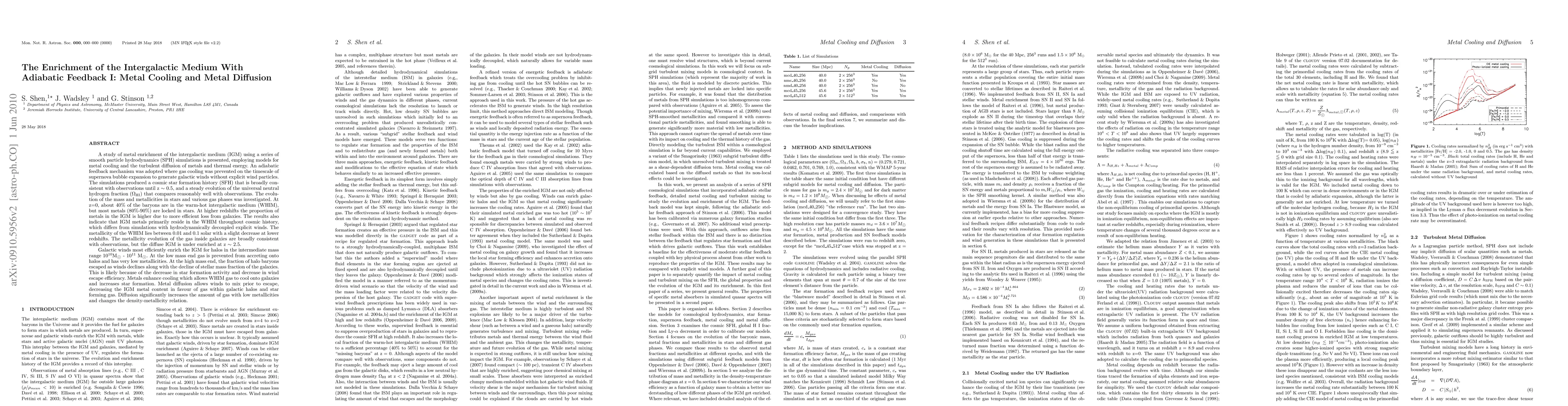 A study of the IGM metal enrichment using a series of SPH simulations is presented, employing metal cooling and turbulent diffusion of metals and thermal energy. An adiabatic feedback mechanism was adopted where gas cooling was prevented to generate galactic winds without explicit wind particles. The simulations produced a cosmic star formation history (SFH) that is broadly consistent with observations until z $\sim$ 0.5, and a steady evolution of the universal neutral hydrogen fraction ($\Omega_{\rm H I}$). At z=0, about 40% of the baryons are in the warm-hot intergalactic medium (WHIM), but most metals (80%-90%) are locked in stars. At higher z the proportion of metals in the IGM is higher due to more efficient loss from galaxies. The IGM metals primarily reside in the WHIM throughout cosmic history. The metallicity evolution of the gas inside galaxies is broadly consistent with observations, but the diffuse IGM is under enriched at z $\sim$ 2.5. Galactic winds most efficiently enrich the IGM for halos in the intermediate mass range $10^{10}$M$_{\sun}$ - $10^{11}$ M$_{\sun}$. At the low mass end gas is prevented from accreting onto halos and has very low metallicities. At the high mass end, the fraction of halo baryons escaped as winds declines along with the decline of stellar mass fraction of the galaxies. This is likely because of the decrease in star formation activity and in wind escape efficiency. Metals enhance cooling which allows WHIM gas to cool onto galaxies and increases star formation. Metal diffusion allows winds to mix prior to escape, decreasing the IGM metal content in favour of gas within galactic halos and star forming gas. Diffusion significantly increases the amount of gas with low metallicities and changes the density-metallicity relation.