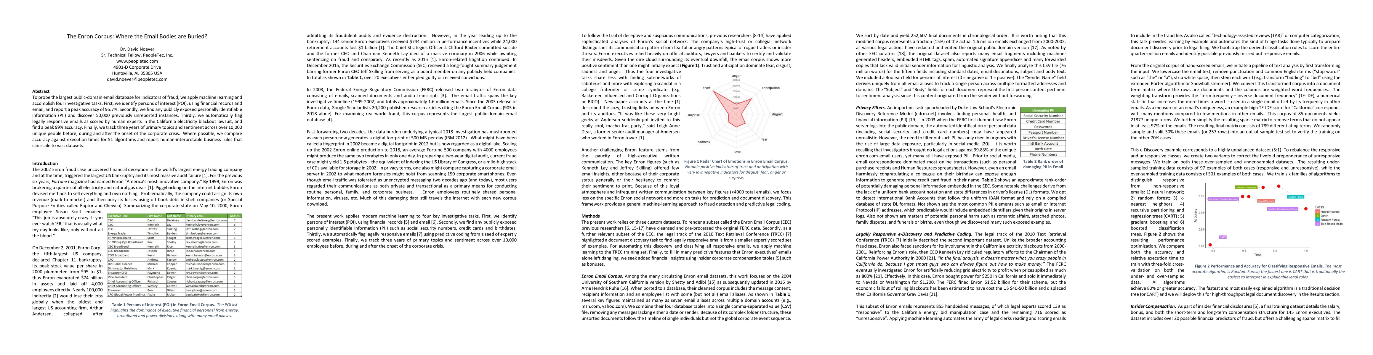 To probe the largest public-domain email database for indicators of fraud, we apply machine learning and accomplish four investigative tasks. First, we identify persons of interest (POI), using financial records and email, and report a peak accuracy of 95.7%. Secondly, we find any publicly exposed personally identifiable information (PII) and discover 50,000 previously unreported instances. Thirdly, we automatically flag legally responsive emails as scored by human experts in the California electricity blackout lawsuit, and find a peak 99% accuracy. Finally, we track three years of primary topics and sentiment across over 10,000 unique people before, during and after the onset of the corporate crisis. Where possible, we compare accuracy against execution times for 51 algorithms and report human-interpretable business rules that can scale to vast datasets.