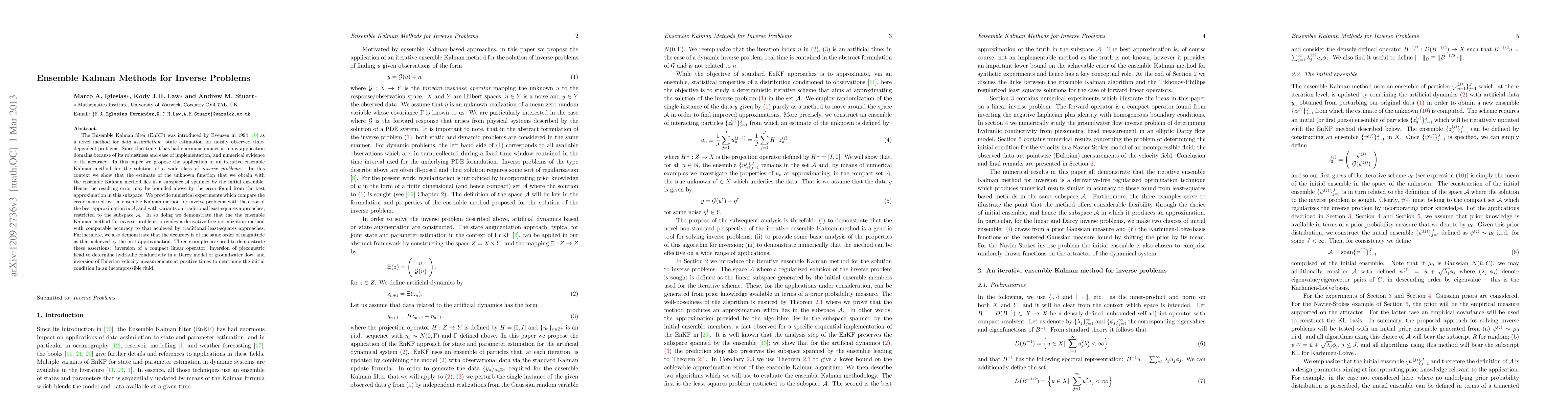 This paper proposes an iterative ensemble Kalman filter for solving inverse problems, demonstrating its accuracy through numerical experiments. The results show that the ensemble Kalman method provides comparable accuracy to traditional least-squares approaches, with error bounded by the best approximation in the subspace defined by the initial ensemble.