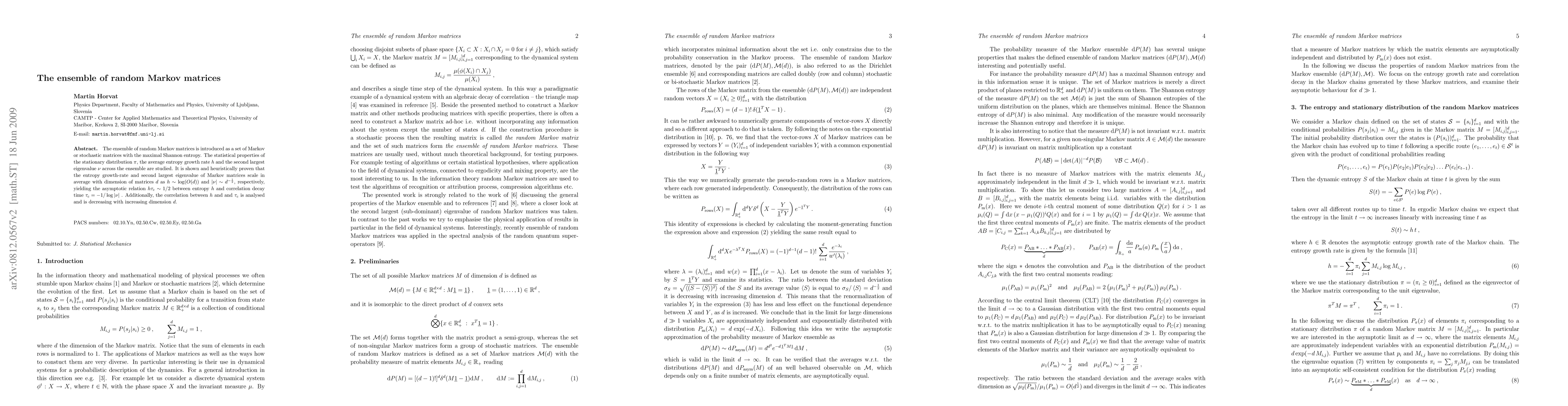 The ensemble of random Markov matrices is introduced as a set of Markov or stochastic matrices with the maximal Shannon entropy. The statistical properties of the stationary distribution pi, the average entropy growth rate $h$ and the second largest eigenvalue nu across the ensemble are studied. It is shown and heuristically proven that the entropy growth-rate and second largest eigenvalue of Markov matrices scale in average with dimension of matrices d as h ~ log(O(d)) and nu ~ d^(-1/2), respectively, yielding the asymptotic relation h tau_c ~ 1/2 between entropy h and correlation decay time tau_c = -1/log|nu| . Additionally, the correlation between h and and tau_c is analysed and is decreasing with increasing dimension d.