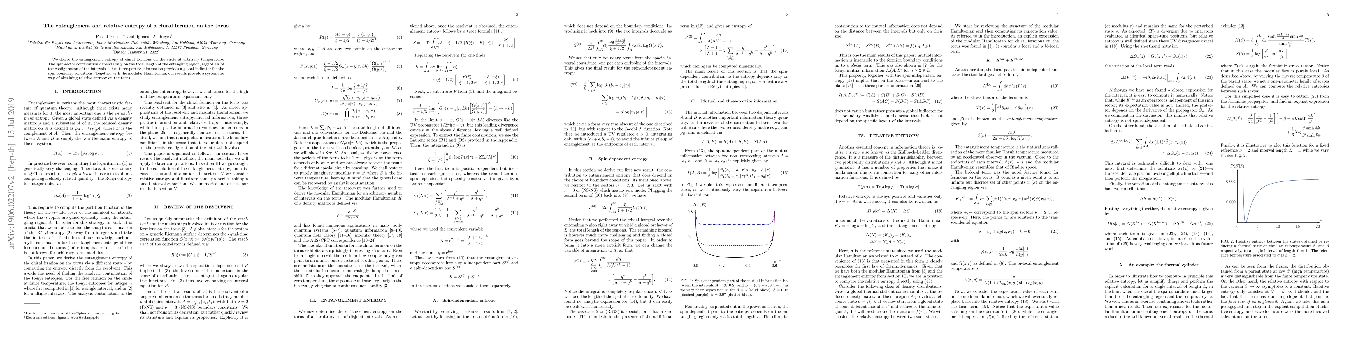 Summary: This paper derives the entanglement entropy of chiral fermions on a circle at any temperature, revealing that the spin-sector contribution is configuration-independent. It also presents a method to systematically compute relative entropy on the torus using three-partite information and the modular Hamiltonian.