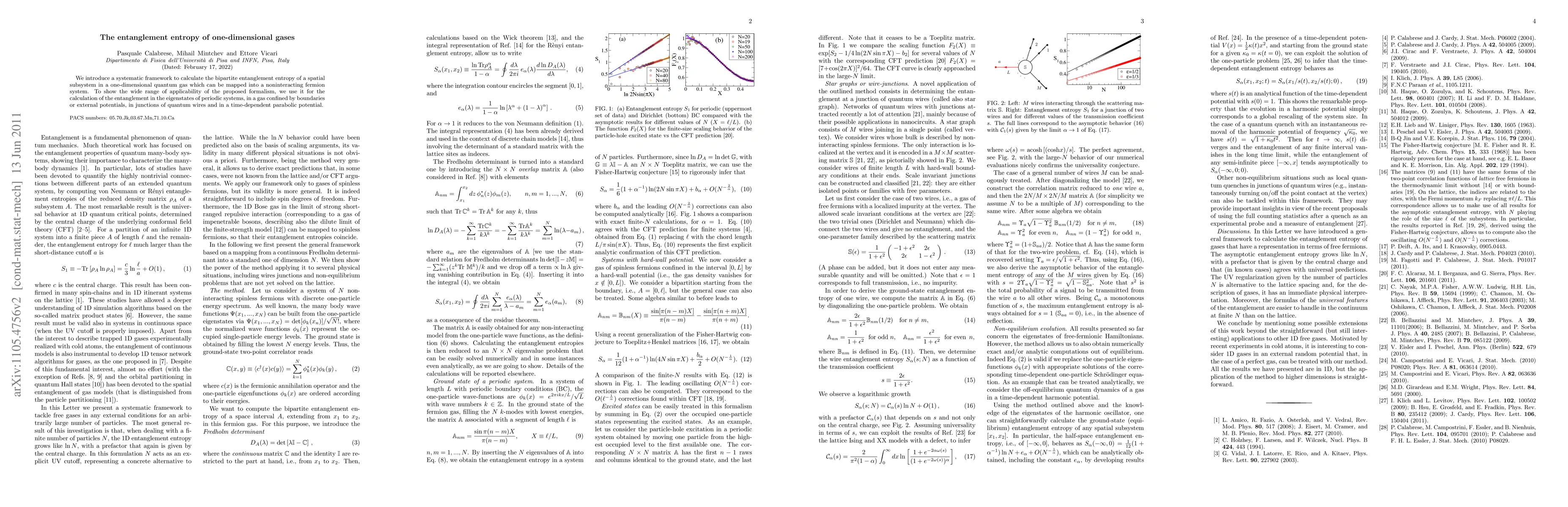 We introduce a systematic framework to calculate the bipartite entanglement entropy of a spatial subsystem in a one-dimensional quantum gas which can be mapped into a noninteracting fermion system. To show the wide range of applicability of the proposed formalism, we use it for the calculation of the entanglement in the eigenstates of periodic systems, in a gas confined by boundaries or external potentials, in junctions of quantum wires and in a time-dependent parabolic potential.