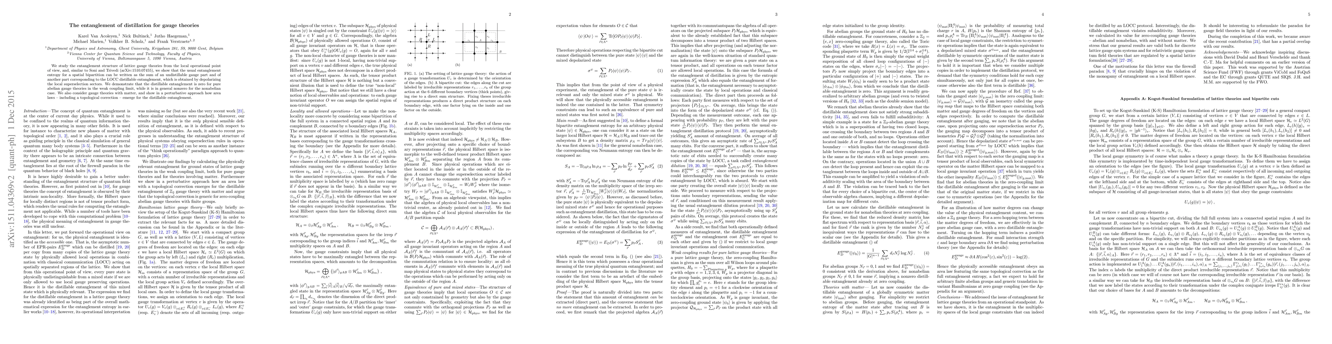 This paper investigates the entanglement structure in lattice gauge theories, revealing that entanglement entropy comprises an undistillable gauge part and a distillable part obtained via local operations. It finds that distillable entanglement is zero for abelian gauge theories but generally nonzero for nonabelian ones, and demonstrates how area laws emerge in gauge theories with matter.