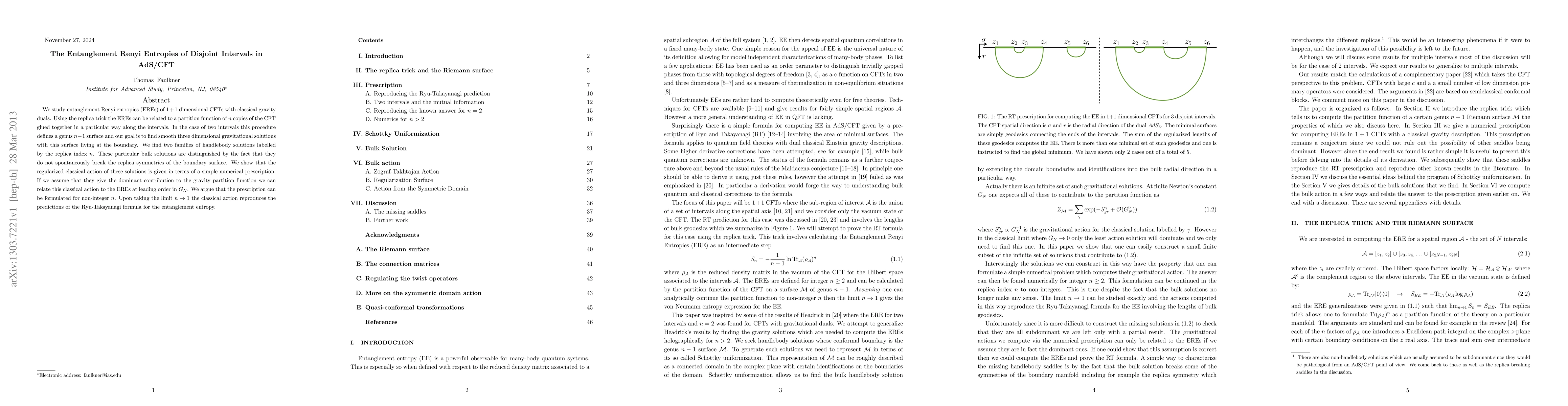 Researchers found two families of smooth gravitational solutions that don't break replica symmetries in AdS/CFT, leading to a simple numerical prescription for the classical action, which reproduces the Ryu-Takayanagi formula for entanglement entropy at n -> 1.