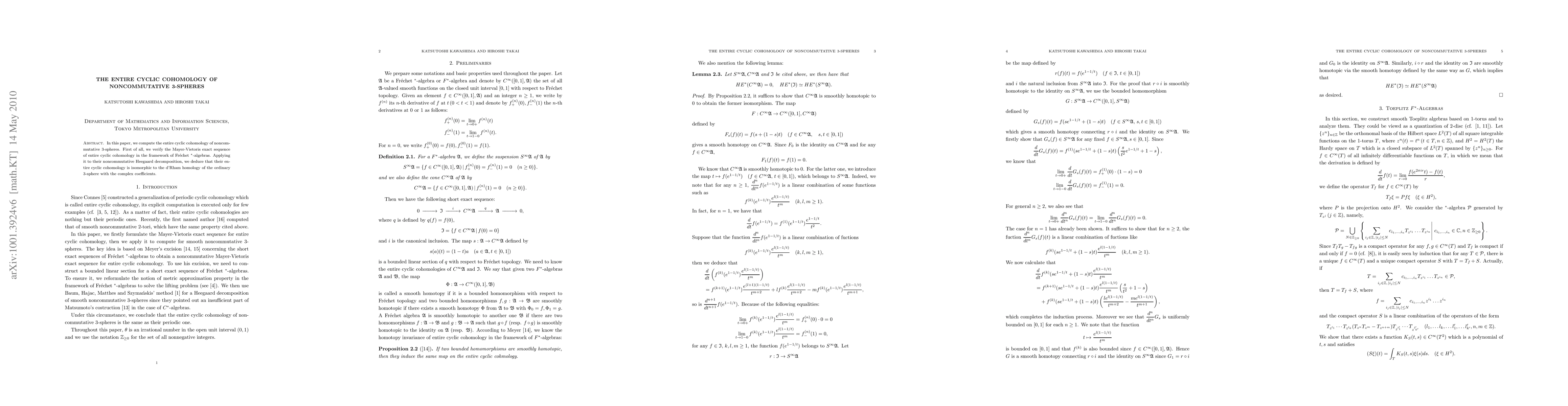 This paper calculates the complete cyclic cohomology of noncommutative 3-spheres, confirming the Mayer-Vietoris exact sequence in Fr\'echet $^*$-algebras and showing it corresponds to the d'Rham homology of the ordinary 3-sphere with complex coefficients.