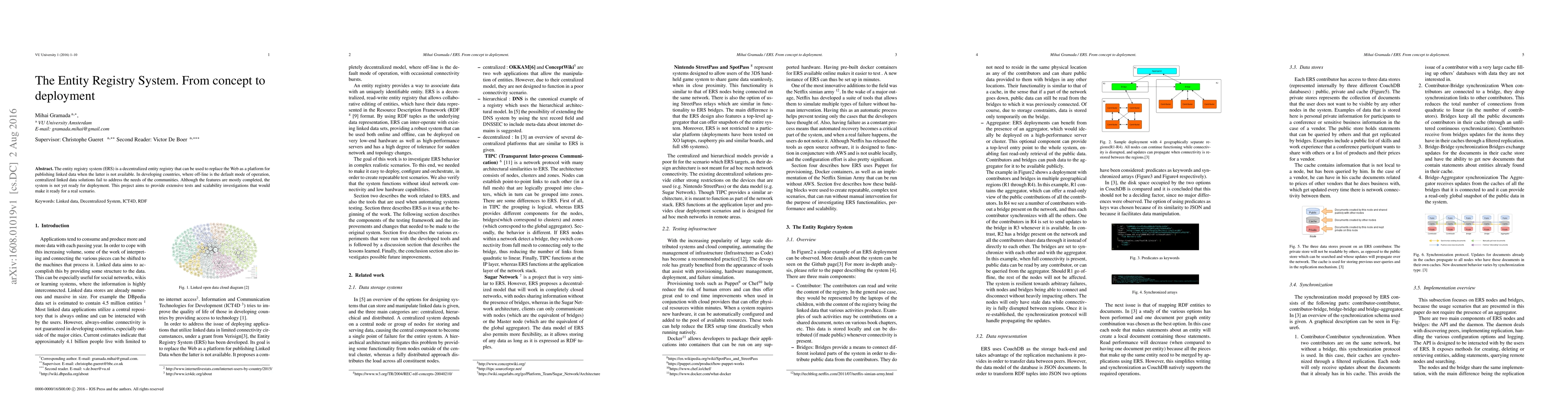 The main technical contribution is the design and testing of the ERS, a decentralized entity registry system that uses CouchDB for storage and replication, with a flexible data model that can represent RDF tuples as JSON documents.