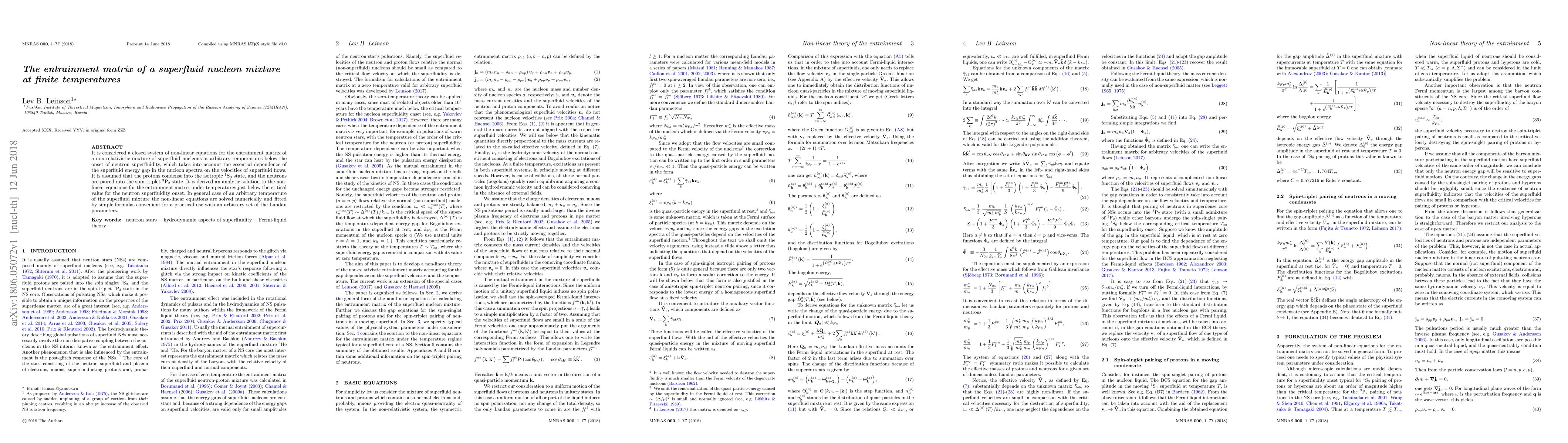 This paper derives an analytic solution for the entrainment matrix of a superfluid nucleon mixture at temperatures just below the onset of neutron superfluidity, considering the dependence of the superfluid energy gap on flow velocities. For arbitrary temperatures, it numerically solves the non-linear equations and provides practical formulas using Landau parameters.