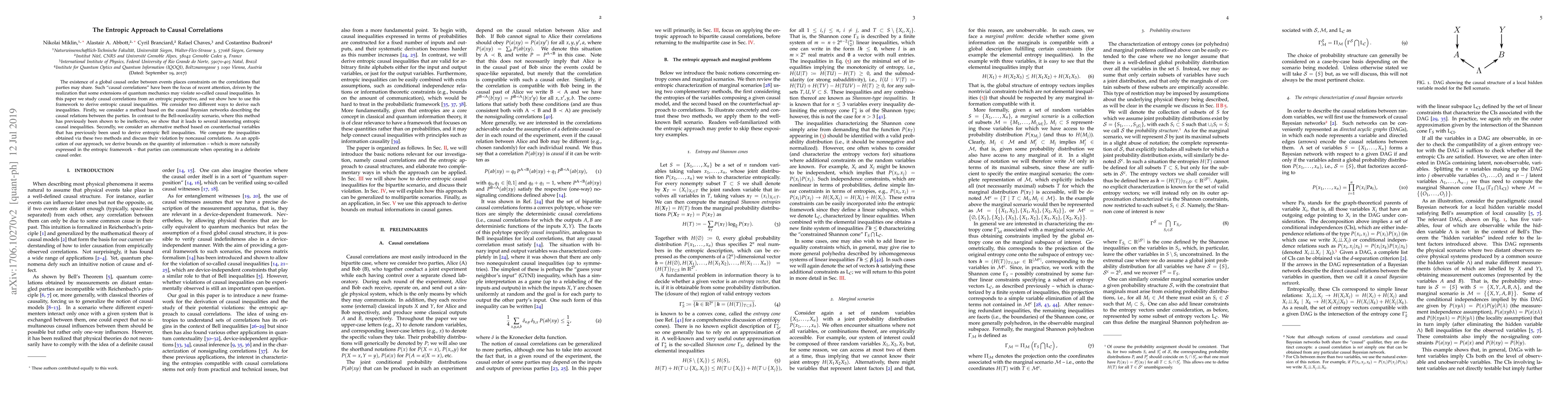 This paper explores causal correlations from an entropic approach, deriving entropic causal inequalities using causal Bayesian networks and counterfactual variables. It finds that these methods yield interesting inequalities, particularly when compared to Bell-nonlocality scenarios, and applies the framework to set bounds on information communication in a definite causal order.