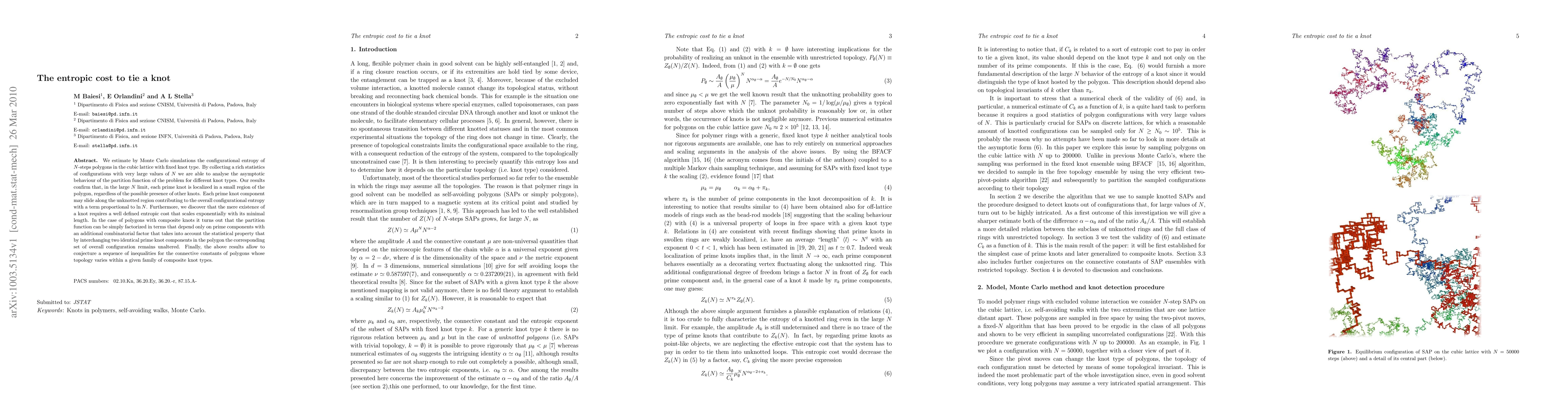 We estimate by Monte Carlo simulations the configurational entropy of $N$-steps polygons in the cubic lattice with fixed knot type. By collecting a rich statistics of configurations with very large values of $N$ we are able to analyse the asymptotic behaviour of the partition function of the problem for different knot types. Our results confirm that, in the large $N$ limit, each prime knot is localized in a small region of the polygon, regardless of the possible presence of other knots. Each prime knot component may slide along the unknotted region contributing to the overall configurational entropy with a term proportional to $\ln N$. Furthermore, we discover that the mere existence of a knot requires a well defined entropic cost that scales exponentially with its minimal length. In the case of polygons with composite knots it turns out that the partition function can be simply factorized in terms that depend only on prime components with an additional combinatorial factor that takes into account the statistical property that by interchanging two identical prime knot components in the polygon the corresponding set of overall configuration remains unaltered. Finally, the above results allow to conjecture a sequence of inequalities for the connective constants of polygons whose topology varies within a given family of composite knot types.