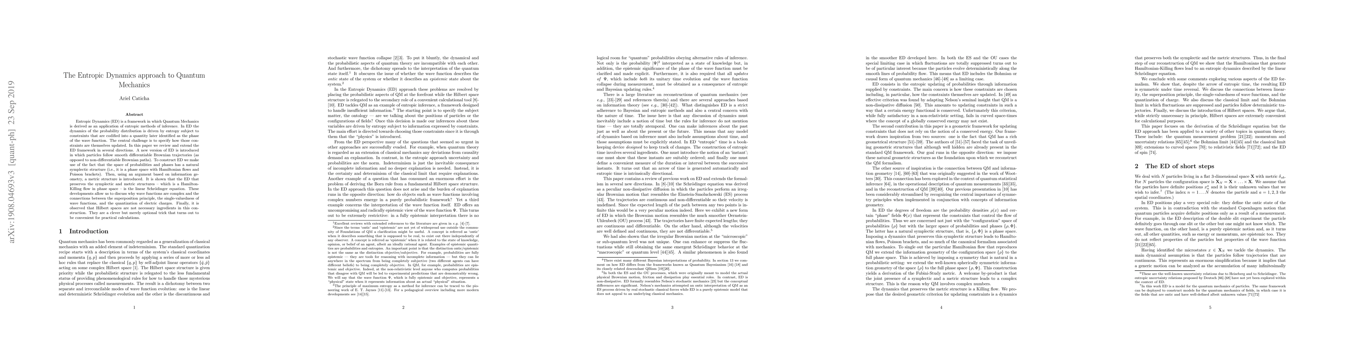 This paper introduces an updated version of Entropic Dynamics (ED) where quantum mechanics is derived using entropic inference, with particles following smooth trajectories. The authors show that ED's symplectic and metric structures lead to the linear Schrödinger equation and discuss the nature of wave functions and quantization without requiring Hilbert spaces.