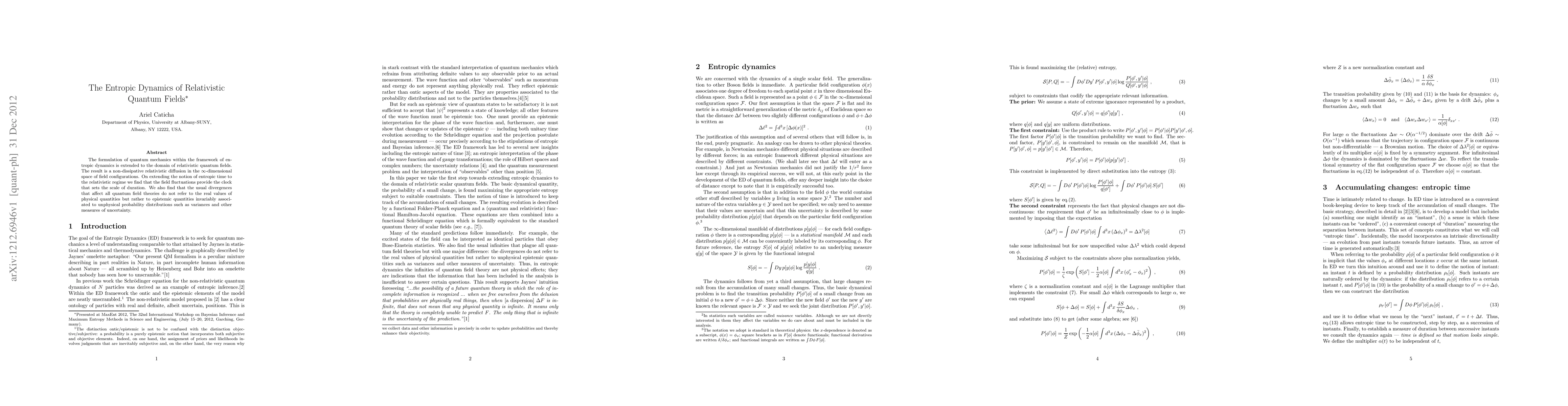 This paper extends entropic dynamics to relativistic quantum fields, resulting in a non-dissipative relativistic diffusion. It argues that field fluctuations define the entropic time scale, and that divergences in quantum field theories relate to epistemic uncertainties rather than physical quantities.