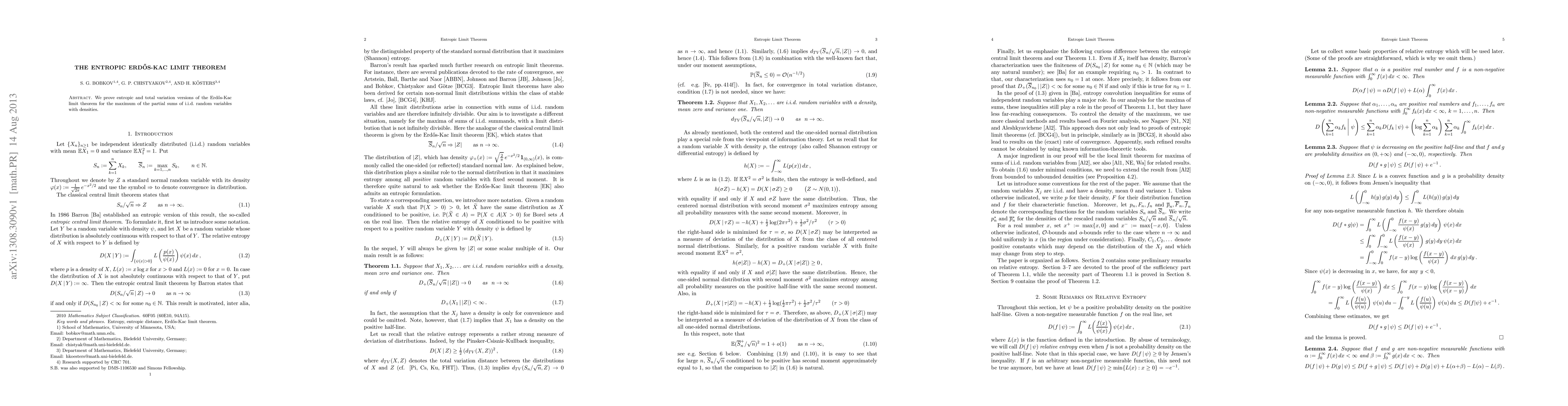 Summary: This paper establishes entropic and total variation convergence versions of the Erdős-Kac limit theorem for the maximum of partial sums of independent and identically distributed random variables, providing new insights into the distribution of these maxima.
