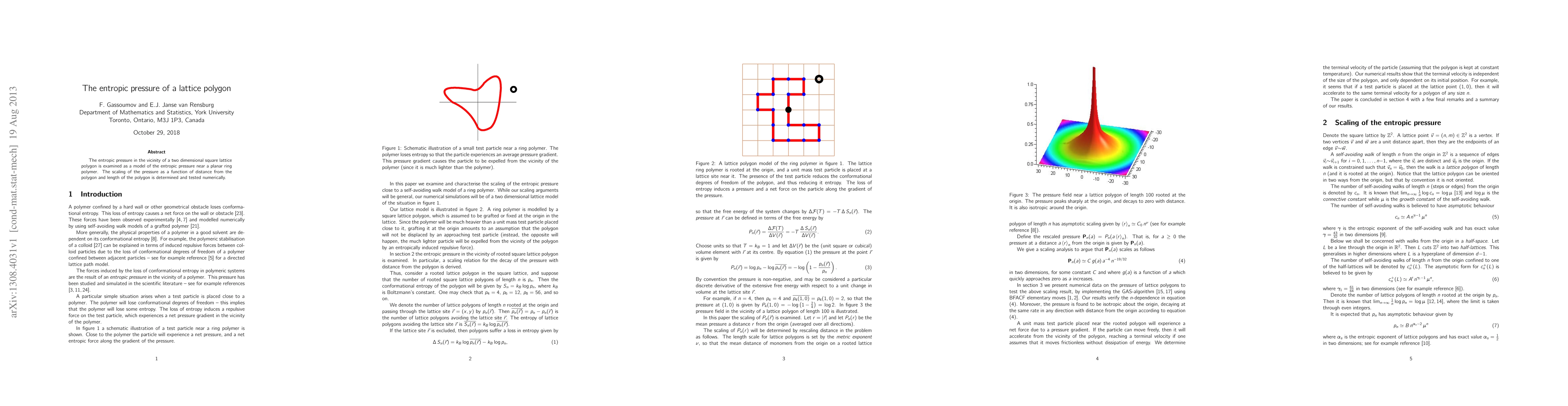 Summary: This paper investigates the entropic pressure around a two-dimensional square lattice polygon, modeling the pressure near a planar ring polymer, and determines its scaling behavior with distance and polygon length through numerical testing.