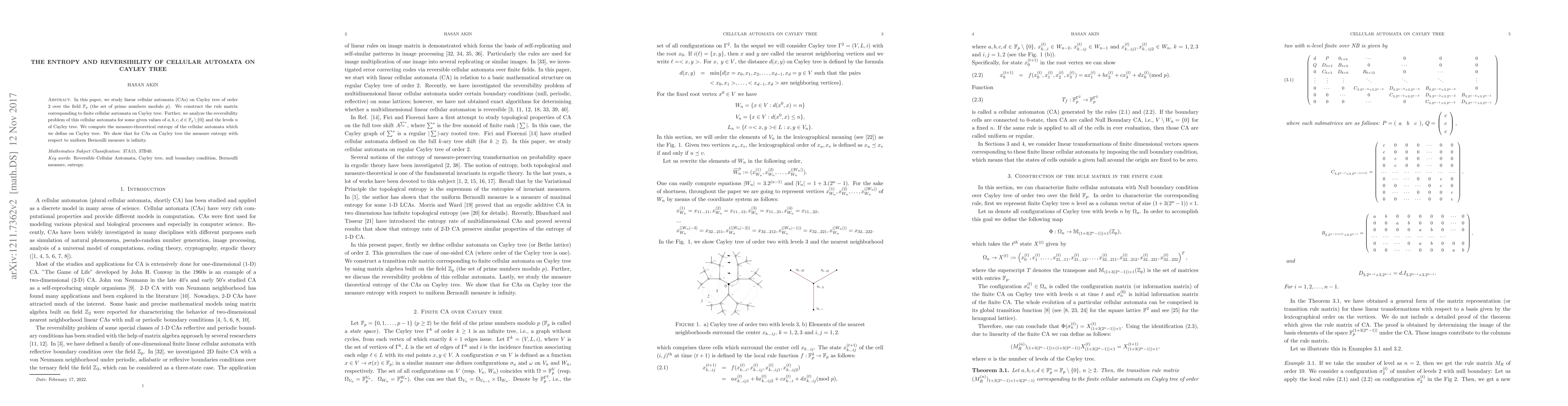 In this paper, we study linear cellular automata (CAs) on Cayley tree of order 2 over the field $\mathbb F_p$ (the set of prime numbers modulo $p$). We construct the rule matrix corresponding to finite cellular automata on Cayley tree. Further, we analyze the reversibility problem of this cellular automaton for some given values of $a,b,c,d\in \mathbb{F}_{p}\setminus \{0\}$ and the levels $n$ of Cayley tree. We compute the measure-theoretical entropy of the cellular automata which we define on Cayley tree. We show that for CAs on Cayley tree the measure entropy with respect to uniform Bernoulli measure is infinity.