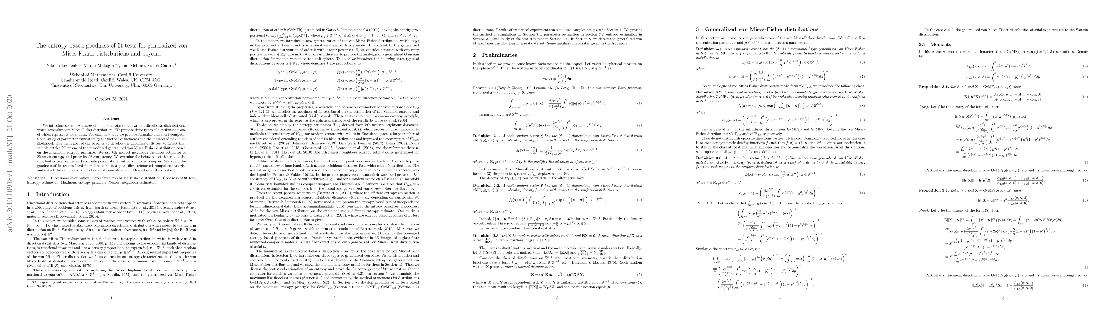 This paper introduces new unimodal, rotational invariant directional distributions that generalize the von Mises-Fisher distribution, and develops entropy-based goodness of fit tests for these distributions. The tests utilize $k$th nearest neighbour distances to estimate Shannon entropy and are applied to both simulated and real data, including local fiber directions in composite materials.