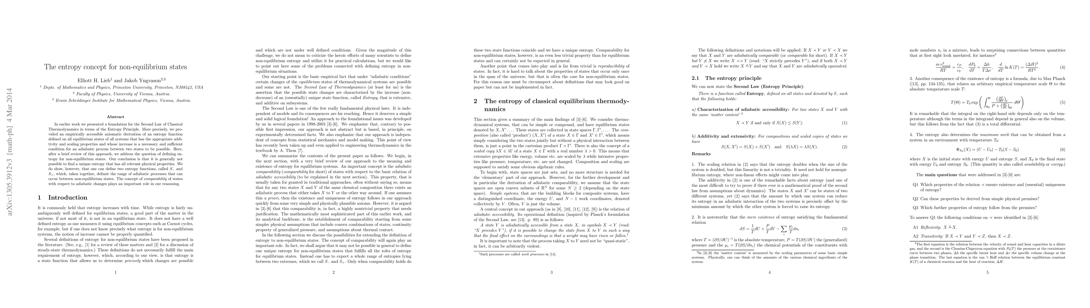 In earlier work we presented a foundation for the Second Law of Classical Thermodynamics in terms of the Entropy Principle. More precisely, we provided an empirically accessible axiomatic derivation of an entropy function defined on all equilibrium states of all systems that has the appropriate additivity and scaling properties and whose increase is a necessary and sufficient condition for an adiabatic process between two states to be possible. Here, after a brief review of this approach, we address the question of defining entropy for non-equilibrium states. Our conclusion is that it is generally not possible to find a unique entropy that has all relevant physical properties. We do show, however, that one can define two entropy functions, called $S_-$ and $S_+$, which, taken together, characterize the range of adiabatic processes that can occur between non-equilibrium states. The concept of {\it comparability} of states with respect to adiabatic changes plays an important role in our reasoning.