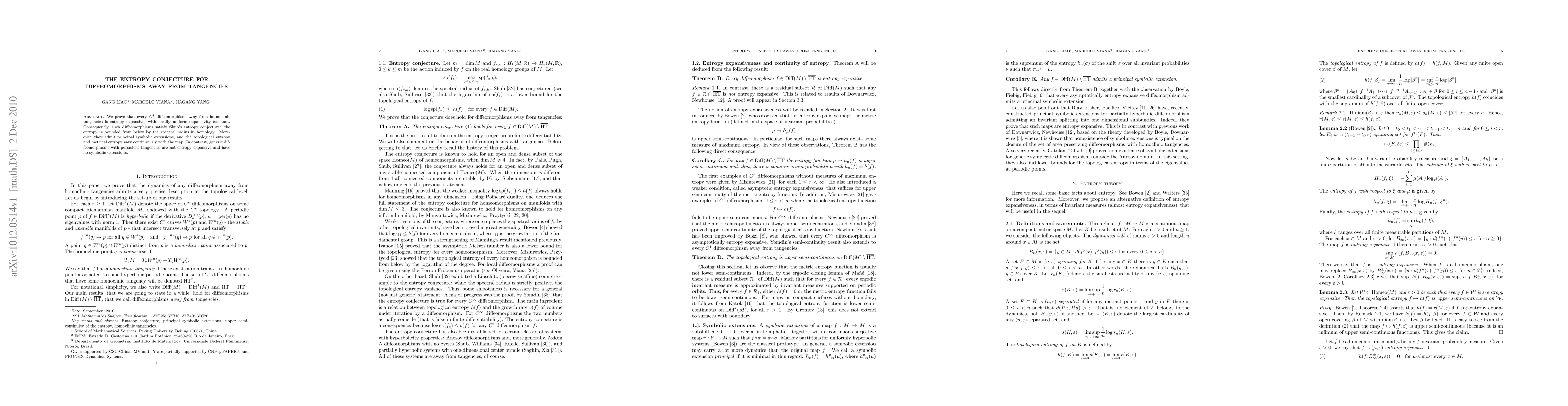 This paper proves that C1 diffeomorphisms without homoclinic tangencies are entropy expansive, satisfying Shub's conjecture that entropy is bounded below by the spectral radius in homology. It also shows these diffeomorphisms have continuous topological and metrical entropy and admit principal symbolic extensions.