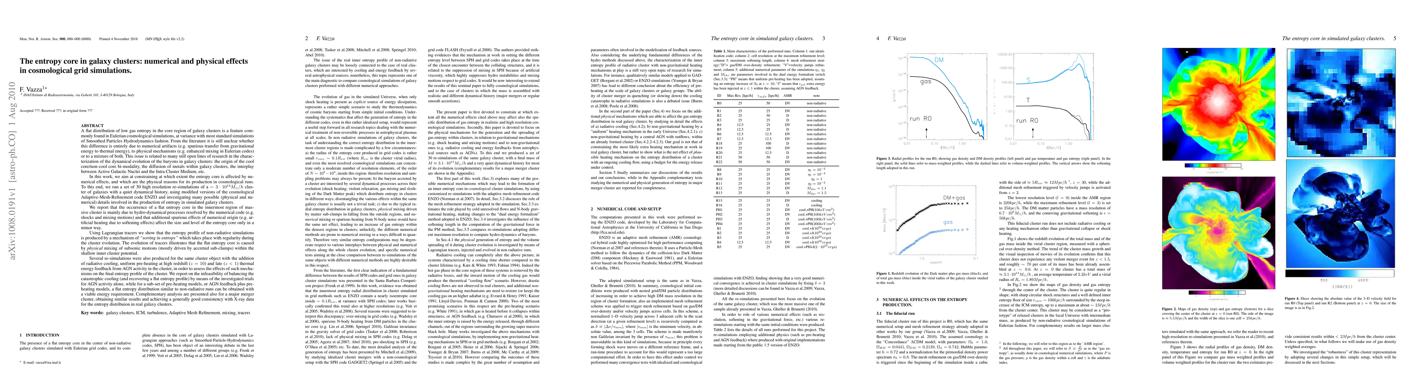 We investigated the numerical and physical reasons leading to a flat distribution of low gas entropy in the core region of galaxy clusters, as commonly found in grid cosmological simulations. To this end, we run a set of 30 high resolution re-simulations of a 3 x 10^14 M_sol/h cluster of galaxies with the AMR code ENZO, exploring and investigating the details involved in the production of entropy in simulated galaxy clusters. The occurrence of the flat entropy core is found to be mainly due to hydro-dynamical processes resolved in the code and that additional spurious effects of numerical origin (e.g. artificial heating due to softening effects or N-body noise) can affect the size and level of the entropy core only in a minor way. We show that the entropy profile of non-radiative simulations is produced by a mechanism of "sorting in entropy" which takes place with regularity during the cluster evolution. Using gas tracers we prove that the flat entropy core is caused by physical mixing of gravity-driven subsonic motions within the shallow inner cluster potential. Re-simulations were also produced for the same cluster object with the addition of radiative cooling, uniform pre-heating at high redshift (z=10) and late (z<1) thermal energy feedback from AGN activity in the cluster, in order to assess the effects of such mechanisms on the final entropy profile of the cluster. We report on the infeasibility of balancing the catastrophic cooling and recovering a flat entropy profile with the investigated trials for AGN activity alone, while for a sub-set of pre-heating models, or AGN feedback plus pre-heating models, a flat entropy distribution similar to non-radiative runs can be obtained with a viable energy requirement, and in good consistency with X-ray observations.
