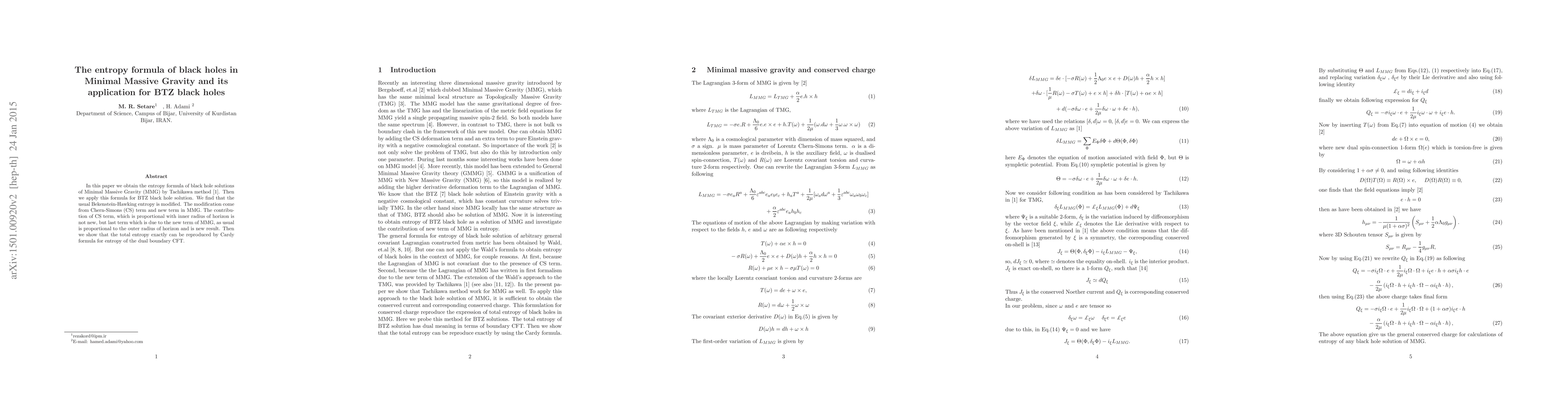 In this paper we obtain the entropy formula of black hole solutions of Minimal Massive Gravity (MMG) by Tachikawa method \cite{a}. Then we apply this formula for BTZ black hole solution. We find that the usual Bekenstein-Hawking entropy is modified. The modification come from Chern-Simons (CS) term and new term in MMG. The contribution of CS term, which is proportional with inner radius of horizon is not new, but last term which is due to the new term of MMG, as usual is proportional to the outer radius of horizon and is new result. Then we show that the total entropy exactly can be reproduced by Cardy formula for entropy of the dual boundary CFT.