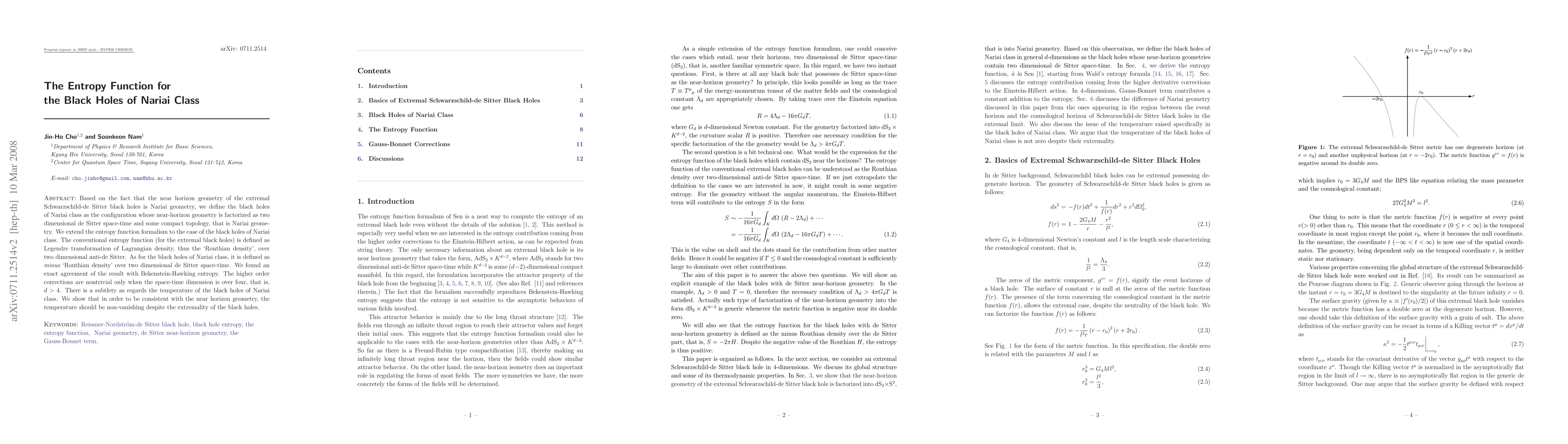 Based on the fact that the near horizon geometry of the extremal Schwarzschild-de Sitter black holes is Nariai geometry, we define the black holes of Nariai class as the configuration whose near-horizon geometry is factorized as two dimensional de Sitter space-time and some compact topology, that is Nariai geometry. We extend the entropy function formalism to the case of the black holes of Nariai class. The conventional entropy function (for the extremal black holes) is defined as Legendre transformation of Lagrangian density, thus the `Routhian density', over two dimensional anti-de Sitter. As for the black holes of Nariai class, it is defined as {\em minus} `Routhian density' over two dimensional de Sitter space-time. We found an exact agreement of the result with Bekenstein-Hawking entropy. The higher order corrections are nontrivial only when the space-time dimension is over four, that is, $d>4$. There is a subtlety as regards the temperature of the black holes of Nariai class. We show that in order to be consistent with the near horizon geometry, the temperature should be non-vanishing despite the extremality of the black holes.