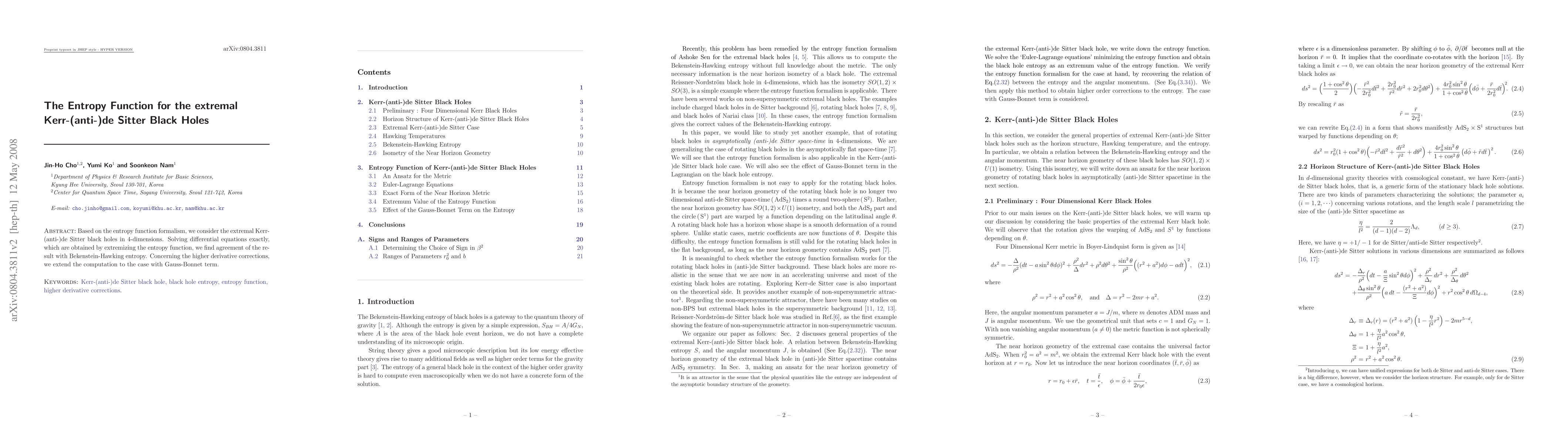 This paper uses the entropy function formalism to study extremal Kerr-(anti-)de Sitter black holes in 4-dimensions, deriving results that match Bekenstein-Hawking entropy and extending computations to include higher derivative corrections with Gauss-Bonnet terms.