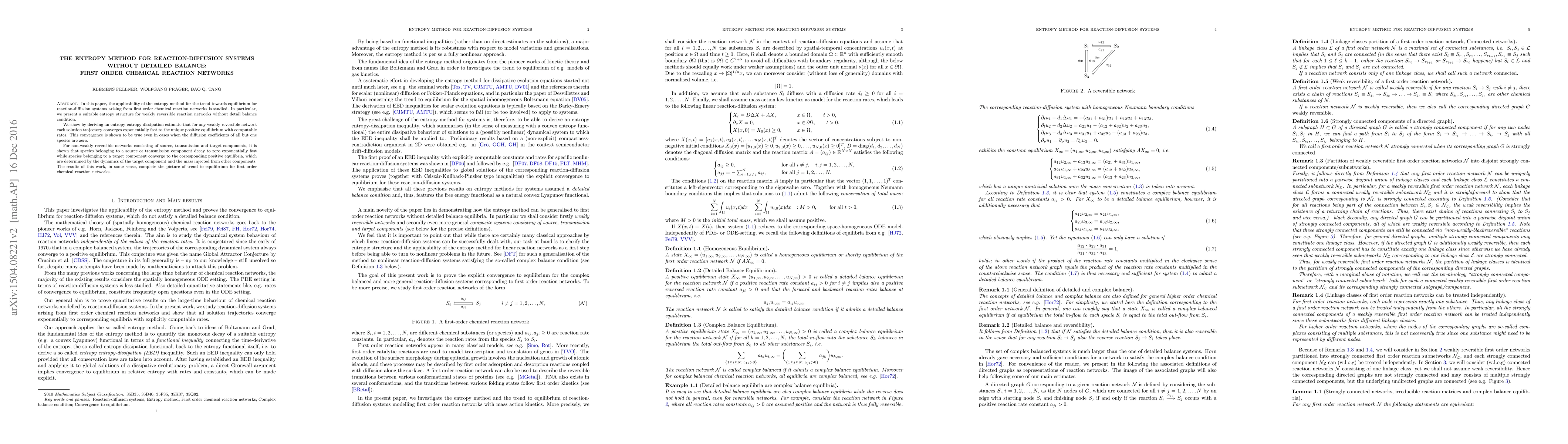 This paper develops an entropy method for first-order chemical reaction networks in reaction-diffusion systems, demonstrating exponential convergence to equilibrium for weakly reversible networks without detailed balance. For non-weakly reversible networks, it shows that species from source/transmission components decay while those in target components converge to equilibria.